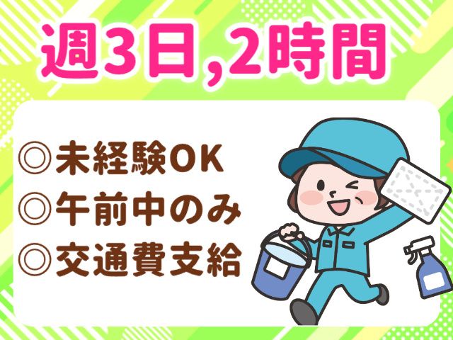 仕事内容 <パート/人気の日勤> マンションの清掃スタッフ募集! 週3日、1日2時間の勤務。 未経験OK!子育て世代活躍中! <お仕事内容> マンションの日常清掃をお願いします。 ~主な作業について~ ・共用部の掃き掃除やモップ掛け ・手摺、ガラス、インターフォン、 集合ポストなどの拭き掃除 などの清掃業務になります。 難しい作業はございません! ご家庭でのお掃除スキルも活かせます。 清掃業務未経験の方も活躍中! <勤務地> 太白区柳生のマンション <平日のみの勤務> 月、水、金の週3日勤務、 火、木、土、日の週4日お休みです! 若年層から中高年・シニアまでの 幅広い年代の方、子育て中の方活躍中! <朝はゆっくり9時出勤> 勤務時間は9:00~11:00の1日2時間! 朝は少しゆっくり出社、 午前中にお仕事終了するので 午後の時間を有効活用できます! 平日の週3日勤務かつ土日休みなので 予定も計画しやすいです! <こんな方におすすめ!> ・朝が忙しい子育て世代の方 ・家庭と両立したい主婦(夫)さん ・清掃のお仕事に興味がある方 ・扶養内勤務をお探しの方 ・体に無理なく働きたい方 ・土日祝は休みたい方 清掃のお仕事は年齢関係なく活躍できるお仕事です。 興味がある方、アルバイト・パートのお仕事を お探しの方はぜひご応募ください。 お待ちしております。 <出張面接可能> ご自宅の近くで面接できます。 まずはお気軽にご応募ください!