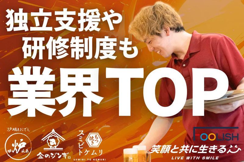 求めている人材 【応募資格】 *20歳以上の方(受動喫煙防止のため) *日本語での接客・コミュニケーションがスムーズにできる方 ※以下の条件を満たす方※ ・日本語能力検定N1レベル、または同等の会話力をお持ちの方 ・就労制限のない在留資格をお持ちの方 (永住者/日本人の配偶者等/永住者の配偶者等/定住者/特別永住者) ⭐人柄・情熱採用⭐ 学歴不問・未経験大募集! 飲食経験がある方は優遇! 即戦力として活躍したい方も必見! 《 ✨こんな方にピッタリ✨ 》 ✋とにかく稼ぎたい人! ✋仲間と青春したい人! ✋バイトの楽しさを社会人でも味わいたい! ✋勢いで人生変えたい人! ✋ベンチャーっぽいノリ、好きな人! 「やってみたい!」って言える あなたなら大歓迎♪ ===求人をご覧の皆さまへ! ✨最終面接担当よりメッセージ✨=== 「笑顔と共に生きる」 ──その想いを、これからの仲間と共に。 私たちFOOLISHは、2017年にスタートしてから、 都内中心に「呼炉凪来(ころなぎらい)」や 「スミビトケムリ」など、 流行りのトレンド居酒屋をどんどん出店してます✨ いまや全国で50店舗以上!でもまだまだ満足してません✋ “もっとたくさんの笑顔を届けたい!” ってことで、目指せ100店舗&その先へ! …というわけで、仲間を絶賛募集中⏩ お客様はもちろんのこと、 取引先様、スタッフなど、 私たちに関わるすべての人々に “たくさんの笑顔”を届けるべく、 現状に満足することなく、 さらなる成長・発展を目指しています。 ■人柄・情熱採用! 面接で聞きたいのは、 「なぜFOOLISHで働きたいのか」 「どんな未来を描いているのか」 あなたの“本気の想い”です。 研修制度やサポート体制も整っているので、 中途でもスムーズにキャッチアップ可能。 ✅スキルを最大限に活かせるポジションを用意 ✅マネジメント・ブランド開発への挑戦も歓迎 ✅独立支援制度あり(実績あり) ■ FOOLISHの考える仕事とは。 私たちにとって飲食とは、 お客さんに「幸せな時間だったな〜」って思ってもらえる場所。 その裏で、スタッフが笑って、支え合って、楽しんでる。 これぞ、FOOLISHの真骨頂。 お客さんの笑顔はもちろん、 FOOLISHのメンバー全員が “人生楽しんだもん勝ち”って思ってます✋ ■ 未来のFOOLISHを、あなたとともに。 FOOLISHは、 お客様・スタッフ・関係者みんなに 「たくさんの笑顔」を届けるべく ”100店舗出店”を本気で目指してます。 ただの“飲食業”じゃなく、 人生のドラマが生まれる“舞台”をつくるお仕事。 あなたの夢、想い、チャレンジ。 全部歓迎します。 FOOLISHは、まだまだ進化の途中。 だからこそ、経験豊富なあなたの力が必要です。 飲食の枠を超えて、 人生のドラマが生まれる“舞台”を 一緒に作っていける仲間を募集します。 理念に共感し、本気で未来を変えたい人。 次の主役は、あなたです✨ 年齢の条件と理由:あり(例外事由2号・20歳以上 (受動喫煙防止のため))