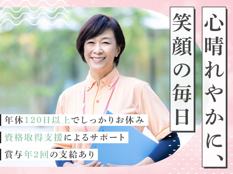 アピールポイント \ 日勤のみで安心 / 勤務時間は8:00~17:00 夜勤なしなので生活も安定 家庭と両立しやすい環境です \ 人で悩まない環境 / 穏やかな利用者様が中心で 職員チームの連携力もバッチリ 相談もしやすい雰囲気です \ 未経験でも安心 / 入社後はOJT研修あり 先輩スタッフがマンツーマンで丁寧に サポートするのでご安心ください