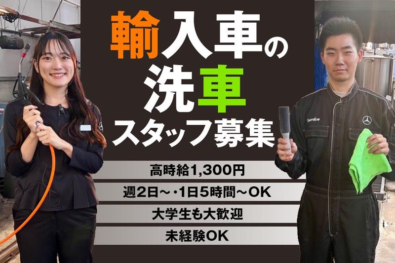仕事内容 ///////// ここがポイント!! /////////// ★未経験の方でも大歓迎! 作業はある程度機械がしてくれるので、 初めての方でも すぐにできるようになります! ★週3日~、1日5時間~OK! 土日だけの勤務もOK! シフトはご希望を最大限考慮! ★大学生大歓迎! 現在、金沢大学や 金沢星稜大学の学生さんが活躍中! 学校やサークル・部活との 両立ができるよう、 シフトも考慮いたします♪ ★時給1,300円の高時給! しっかり稼げます! /////////////////////////////// <具体的なお仕事> メルセデス・ベンツ金沢にて、 お客様に納車する前の洗車や 車内清掃をお任せします。 具体的には、下記のことを行います。 ・洗車機を使用した車の洗車、拭き上げ作業 ・掃除機で車内の清掃 ・工場内での車の移動 ※タイヤ交換時期のみ、 交換したタイヤを タイヤ洗浄機を使用して、 タイヤの洗浄作業を行います。 <ポイント!> ●洗車は手洗いではなく、 洗車機を使用するので楽々です! ●お客様の接客をすることはありません! ●メルセデス・ベンツの車に携わる事ができる! 未経験の方や車の知識がない方でも大歓迎! 周りにスタッフもたくさんいますので、 困ったことやわからないことがあったら すぐにフォローします! 慣れるまでは、先輩スタッフが丁寧に ご指導いたしますので、 初めての方もご安心ください! <石川ヤナセ株式会社とは> FUJISAWA GROUP(石川ヤナセ株式会社、藤沢自動車株式会社)として、 石川県唯一の3ブランドを扱っている輸入車正規ディーラーです。 メルセデス・ベンツ、ボルボ、プジョーの新車・中古車の販売、整備を行っております。 働き方改革や業務改革に積極的に取り組んでおり、社内インフラ整備もしています。 社員とその家族の心身の健康が重要な経営基盤と捉え、「健康経営」を目指しています。 最近では、来店型店舗へ向けた推進活動も積極的に行っています。 - 創業=1950年、男女比率=8:2、平均年齢=30代、平均勤続年数=10年、 産休・育休取得率=100%、中途比率=60%、中途採用の未経験者割合=50%