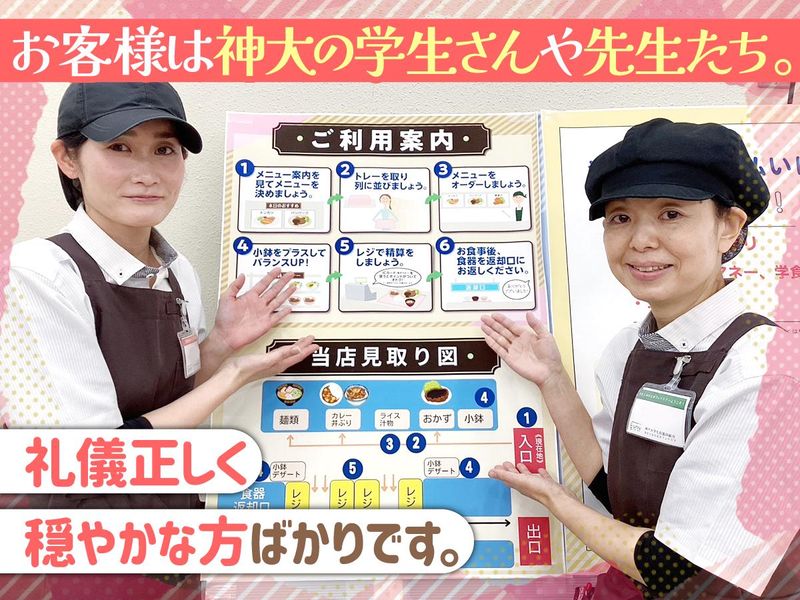 仕事内容 ✨子育ても落ち着いた今だからこそ。 無理なく楽しく 「学食しごと」始めませんか? 神戸大学のカフェテリアで働くスタッフさんは、 40代・50代の主婦(夫)さんが中心。 「家にこもりがちだったけど、ここに来るのが楽しみになった」 「学生さんが娘みたいで、話すと元気をもらえる」 そんな声がよく上がる、あたたかい職場です! *・。*・。*・。*・。*・。*・。*・。 ■ “平日の決まった時間だけ”で生活にメリハリを ・家族の食事づくりや家事の合間に働きたい ・土日は家族とゆっくりしたい ・無理なく続けられる仕事がいい こんな希望がある方にぴったり。 完全平日のみ・昼過ぎには 終わる時間帯だから 生活リズムを崩さず続けやすい環境です。 長期休暇には学食自体がお休みになるので、 旅行や帰省も気兼ねなく行けるのが大きな魅力。 ■ 落ち着いた環境で、穏やかに働けます 神大の学生さんや 先生方が利用される学食なので、 お客様はみんな礼儀正しく穏やか。 中には 「今日の唐揚げめっちゃおいしかったです!」 なんて話しかけてくれる学生さんもいて、 自分の子どもと話しているような、ほっこり時間も。 ガチャガチャした雰囲気はないので、 落ち着いて働きたい方にもぴったりです。 *・。*・。*・。*・。*・。*・。*・。 ■ お仕事は“家事の延長”で覚えやすい 最初は盛付・洗い場からゆっくりスタート。 慣れてきたら少しずつ簡単な調理もお教えします。 ・盛付/提供 ・洗い場(食洗機メイン) ・簡単な調理(茹でる・温めるなど) ・レジ(タッチパネルで簡単) 特別な技術はいりません。 「毎日の料理で慣れているから余裕!」 「覚えやすい」という声が多いです。 家事スキルがそのまま活かせるので、 ブランクがあっても安心。 ■ “決まった流れ”でコツコツ働ける 学食は時間帯ごとにやることが決まっていて、 一定のリズムで進むのが特徴。 「次はこれをすればいいんだな」 と自然に流れがつかめるので、 覚えるのが苦手…という方でも 無理なく慣れていただけます。 黙々と作業したい方にも、 人と話すのが好きな方にも、 どちらにも向いています。 ■ シフトは1週間ごとで調整しやすい ・家庭の予定に合わせて ・平日のみ、短時間だけ ・無理のないペースで など、柔軟に調整できます。 大学が休みの時期は 勤務日数を減らすこともでき、 「2ヶ月まるっと休むスタッフさん」 もいるほど柔軟! 子育てが落ち着いた今、ご自身の時間を 大切にしながら働ける環境です。 *・。*・。*・。*・。*・。*・。*・。 ✨ 最後にひとこと 「家にいるだけじゃつまらない」 「でも、ガッツリ働くのはもうしんどい」 無理なく、気負わず、それでも “人との温かい関わり”を 感じられるお仕事です。