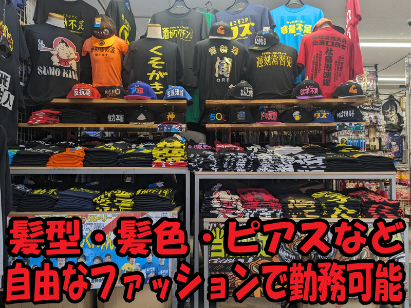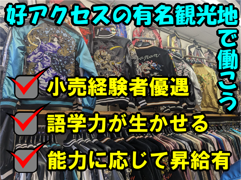仕事内容 【POINT】 ★スカジャンの品揃えは関西最大級 ★有名観光地なのでアクセスは良好 ★20代から40代まで幅広い世代のスタッフが活躍中 ★お客様は日本人と外国人が半分半分で多言語が行き交う国際的な環境 ★英語が話せる方も歓迎 ★社員登用あり ★スタッフ割引あり - 【仕事内容】 ・接客販売 ・品出し ・商品陳列 ・整とん ・レジ ・他、店舗運営に関わる業務全般 少しずつ慣れて頂ければ大丈夫です、。 仕事に慣れてきたら社員不在時の時間帯責任者として勤務をお願いします。 - 【お店について】 天王寺公園のすぐ近く! じゃんじゃん横町にあるスカジャンや オモシロTシャツ・お土産ショップ。 スカジャンの品揃えは関西最大級。 そんな当店の商品を買いに来られる お客様の約半分は海外からの観光客☆ なので日本語以外の言語も話せる方は歓迎! 留学生を含む大学生や専門学生はテスト期間は 休みを多くして夏休みや春休みは勤務を多くするなど 学生生活に合わせた勤務が可能です。 ※詳しい内容は、面接時にご相談ください! - 【服装に制限なし】 ド派手な髪色・髪型OK ボディピアスやネイル・ピアスもOK!