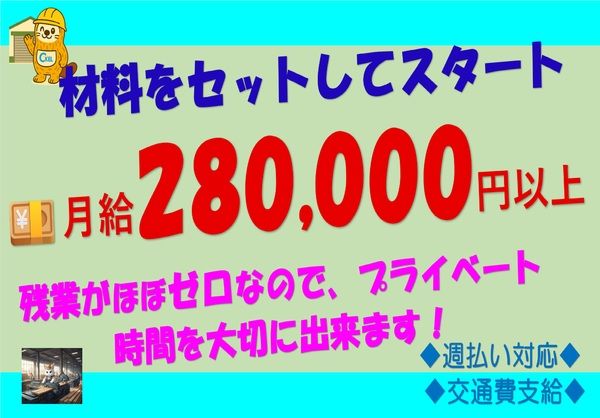 ◆月収例280,000円以上+交通費◆工場内作業◆資格必要なし 残業代を稼ぐより、自分の時間を大切にしたい方へ