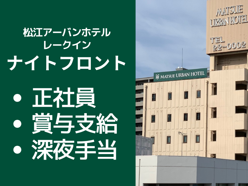 仕事内容 JR松江駅から徒歩約5分、松江観光の拠点にもビジネス利用にも最適な松江アーバンホテルレークインのナイトフロントスタッフの募集です。 ◆JR松江駅から徒歩約5分のホテル! ◆正社員採用!社員数170名・創業約60年の安定企業で安心。 ◆賞与年2回(前年度実績:計2か月) ◆実力次第で昇格や、大幅な昇給も! ◆働きやすく意見の言いやすい環境づくりに取り組んでいます! 【具体的な業務内容】 ・お客様のチェックイン・チェックアウト業務 ・会計業務 ・予約や問い合わせなどの電話対応 ・お客様の案内接客 ・売上集計 など ━‥━‥━‥‥━‥━‥━‥━‥━‥━‥━ ★夜間対応のお仕事です! ¨¨¨¨¨¨¨¨¨¨¨¨¨¨¨¨¨¨¨¨¨¨¨¨¨¨¨¨¨¨¨ お泊まりいただいている お客様の夜間対応に従事いただきます。 夜はお客様がお休みのため、 静かな空間で自分のペースで仕事ができます。 ★ 働きやすさが自慢 ¨¨¨¨¨¨¨¨¨¨¨¨¨¨¨¨¨¨¨¨¨¨¨¨¨¨¨¨¨¨¨ 平均残業時間は10時間未満 休日希望も通りやすい! ★ ホテル未経験も◎ ¨¨¨¨¨¨¨¨¨¨¨¨¨¨¨¨¨¨¨¨¨¨¨¨¨¨¨¨¨¨¨ ホテルの仕事が初めてでも大丈夫! 先輩スタッフが丁寧にレクチャーするので安心です◎ 困ったときは皆で助け合えるチーム力も当社の魅力♪