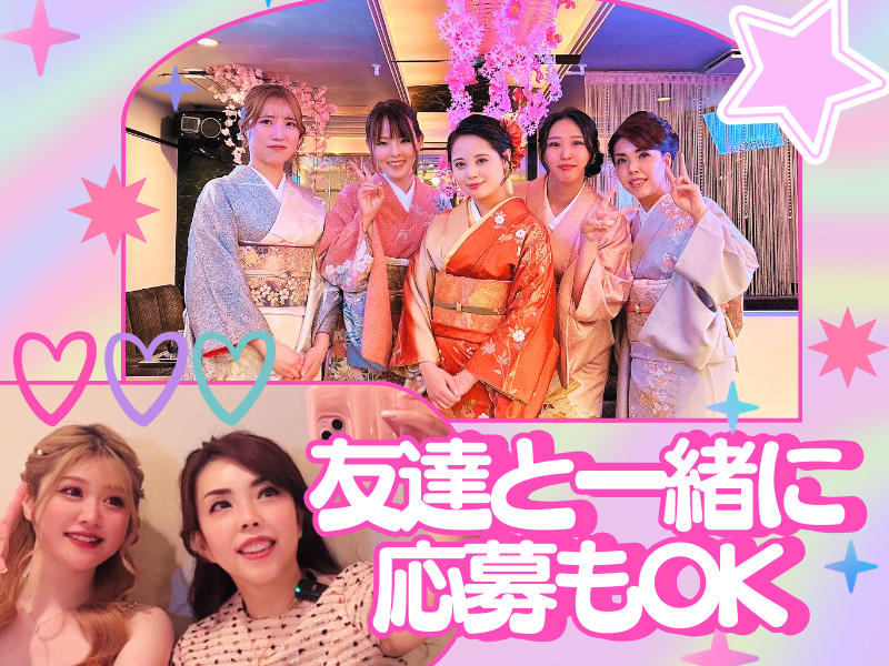 【保険制度】 雇用保険、労災保険、健康保険、厚生年金 待遇・福利厚生 【福利厚生】 ・制服貸与(貸ドレスなど) ・交通費規定支給 ・昇給 ・賞与(ボーナス) ・日払いOK(規定) ・給料手渡しOK(規定) ・履歴書不要 ・ネイルOK ・ピアスOK ・髪型・髪色自由 ・副業、WワークOK ・扶養内OK ・友達同士の応募OK