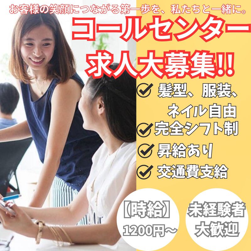 求めている人材 経験者優遇★ ・人と話すのが好きな方 ・コールセンターの経験がある方 ・1人で黙々と作業するのが好きな方 もちろん未経験の方も募集しております! マニュアルもあります。優しい先輩が分からないことは細かく丁寧に教えてくれます! 学生・専門学生・主婦(夫)・Uターン・未経験者・経験者・大学生・フリーター 全員歓迎ー!!! 気軽に面接に来てください♪