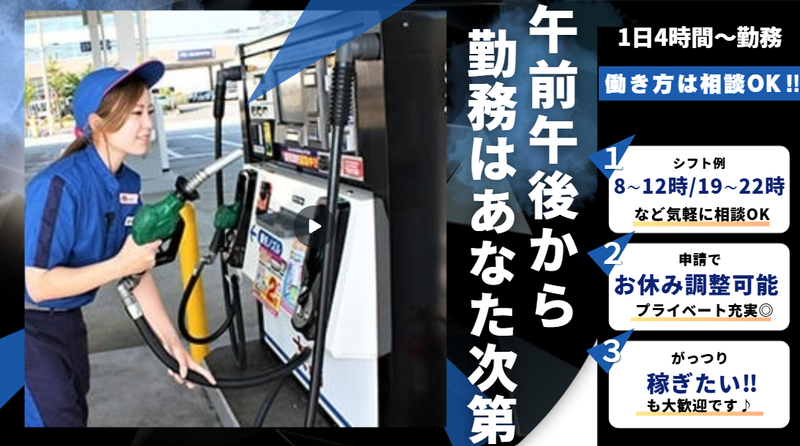 仕事内容 \資格を活かせる×フルタイム勤務で安定収入/ セルフガソスタで【接客少な目&力仕事ナシ】◎ ✨土日祝インセンティブ支給&着替え時間も手当支給✨ ✨♦°˖⭐°˖✨♦°˖⭐°˖✧✨♦°˖⭐°˖✧ 【ここがポイント!】 ◆時給1800円~+インセンティブあり ◆週5日×実働8hで月収29万円以上可能! ◆土日祝の勤務には嬉しい加給あり ⇒1時間につき100円のインセンティブ支給! ◆さらに… ⇒着替え時間にも手当支給あり◎ ✨♦°˖⭐°˖✨♦°˖⭐°˖✧✨♦°˖⭐°˖✧ ー【お仕事内容】ー ◆セルフ式のガソリンスタンドでの接客サポート業務 *給油補助(一部給油作業あり) *店内清掃・整備 *お客様対応(少なめ) →力仕事はほぼナシ! 未経験でも安心して始められる内容です◎ 車に関する知識も必要ナシ! ー【働き方】ー ⏰シフト例: ・8:00~17:00 ・10:00~19:00 ・13:00~22:00 ・9:00~13:00 ・13:00~17:00 など 「安定収入が欲しい」 「フリーターから正社員を目指したい」 そんな方にぴったりの環境です! ー【未経験スタートを全力応援!】ー 初めてでも安心して始められる理由があります! 「ガソリンスタンドって、難しそう…」 「資格がないとできないのかな…」 そんな心配、ここでは一切いりません! ◆セルフ式スタンドだから… ・お客様が自分で給油する仕組み! ・スタッフは”サポート役”がメイン ・力仕事・専門知識も不要です◎ ◆未経験スタートの先輩が多数! 今活躍中のスタッフも、ほとんどが未経験からのスタート。 最初は先輩がマンツーマンで丁寧に教えるので、 「ガソスタデビュー」も安心です♪ ◆資格を活かしながら働ける! 「乙4類危険物取扱者」など、 資格保持者ならではの時給1800円~! 「がっつり稼ぎたい!」 「資格を活かして実践で活かしたい!」 という方にもおススメです♪