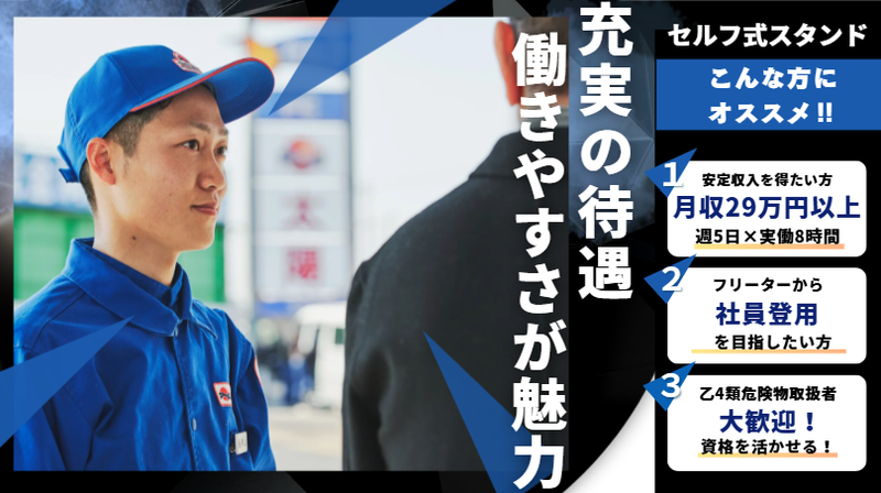 求めている人材 【必須資格】 危険物乙4(乙種第四類危険物取扱者) \学歴不問&ブランク歓迎/ 実際に「やってみたい」で始めた 未経験の先輩も多数活躍中! 人柄・やる気を重視した採用なので、 まずはお気軽にご応募下さい♪ ✅【こんな方にオススメ】 ・フルタイムで安定収入を得たい方 ・シフトにたくさん入りたい方 ・接客よりコツコツ作業が好きな方 ・ルーティンワークが得意な方 ・フリーターから社員登用を目指したい方 ✅【活かせる経験・スキル】 ・セルフガソリンスタンドの勤務経験 ・車検・整備士工場などでの実務経験 ・メカニック、自動車整備士、自動車検査員などの資格・スキル ・カーディーラーでの接客や軽整備経験 ✅【活躍中のスタッフ】 10代~60代まで男女問わず幅広く活躍中! 主婦・主夫、ブランク明けの方も多数在籍しています。 フリーターさん歓迎!