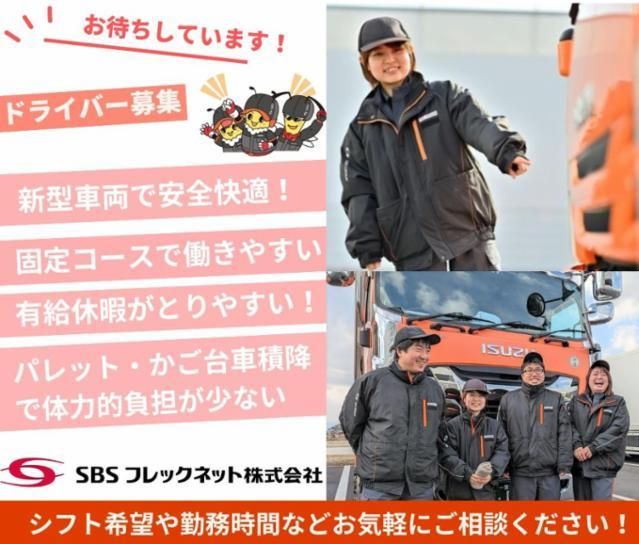 仕事情報 ● 仕事内容 主に納品センターへ商品の配送のお仕事です。スーパーマーケットやセンターなどへ、チルド食品や冷凍品を配送していただきます。配送時はトラックへの荷物の積み込みや、荷下ろしなどもご担当いただきます。業界大手ならではの安定性と福利厚生、働きやすさで、長期的なキャリアアップを築けます! カゴ台車での積み下ろし 基本カゴ台車(カゴテナー)での荷積み・荷降しが基本となります。重たい物の手積み・手降しはほとんどありません。 周囲と協力して荷積みしていくので効率よく荷積みして配送に向かえます。SBSフレックネットは力を合わせて仕事を行う風土があり、連携して業務を進めていきます。 ドライバーコンテスト開催 全国のグループ各社から選抜された優秀なドライバースタッフの方々が、トラックドライバーに求められる高度な運転技能や、関係法令や車両構造に関わる専門的な知識を競います。グループ全体の安全衛生活動における1年の集大成!事故なき社会・事故なき物流企業を目指して2016年より開催しています。 有休休暇のとりやすい環境 希望のお休みを取りやすい環境です。希望シフト提出時に、お気軽にご相談ください。お子様の学校行事も参加したい主婦(夫)の方や、プライベートの時間も大切にされたい方、家族と過ごす時間を大切にされたい方におすすめです。プライベートとお仕事のメリハリをつけて、健康に楽しく働きましょう! 東証プライム上場安定性◎ SBSフレックネットがお届けするのは、お客さまの生活に欠かせない食品。会社の強みである輸配送全国ネットと、低温管理ノウハウは、お客さまの安心安全な「食の当たり前」を支えます。3温度帯に対応できる会社として、業界トップクラスの品質と実績を持つSBSフレックネットで誇りをもってお仕事しませんか?