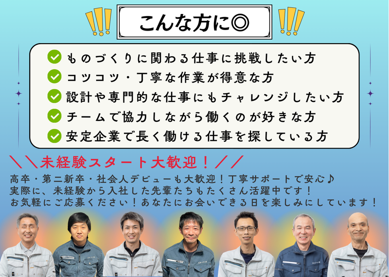 求めている人材 \\未経験スタート大歓迎!// 高卒・第二新卒・社会人デビューも大歓迎! 実際に、未経験から入社した先輩たちもたくさん活躍中です! ≪こんな方に◎≫ ◎未経験からモノづくりに関わる仕事に挑戦したい方 ◎コツコツ・丁寧な作業が得意、または好きな方 ◎将来的に設計や専門的な仕事にもチャレンジしたい方 ◎チームで協力しながら仕事を進めるのが好きな方 ◎安定した業界で、長く働ける仕事を探している方 ◎プライベートも大切にしながら、メリハリある働き方をしたい方 【お気軽にご応募ください!】 あなたにお会いできる日を楽しみにしています♪