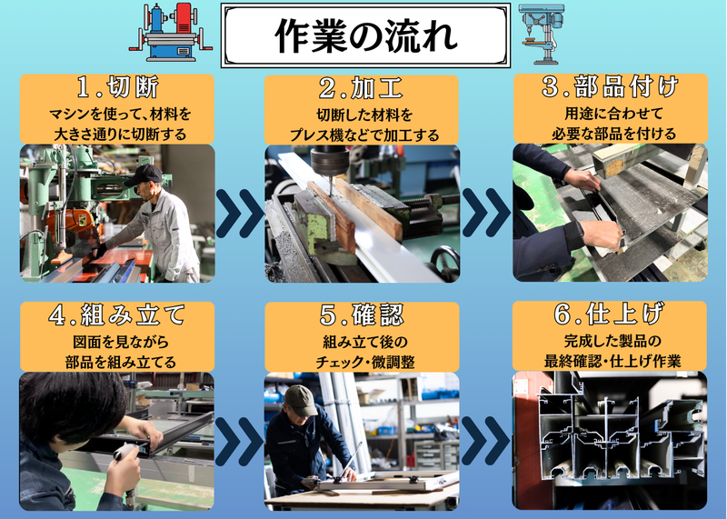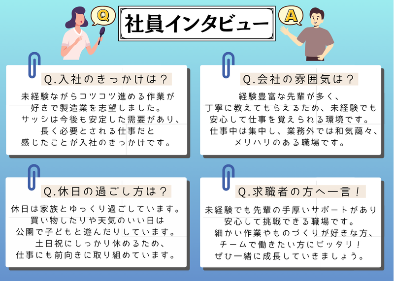 選考プロセス 【募集背景】 ビルや商業施設に欠かせないサッシの需要は年々高まっており、ありがたいことに近年はお仕事のご依頼も増加しています。 そこで今回、体制強化を目的として新しい仲間を募集することになりました! サッシ業界を支え、これからの広和メタル株式会社を一緒に盛り上げてくれる次世代の人材をお迎えしたいと考えています。 スタッフ一人ひとりが無理なく、長く安心して働ける職場づくりを大切にしています。 【入社までの流れ】 応募→書類選考→面接→内定
