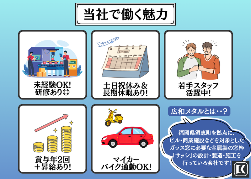仕事内容 \\完全未経験OK// 【工場内作業スタッフ】募集! ✨工場内はエアコン・空調完備✨ 夏も冬も快適な職場環境!季節を問わず集中して働けます◎ ✅どんな会社…? 広和メタル株式会社は、福岡県須恵町を拠点に、ビル・商業施設などを対象としたガラス窓に必要な金属製の窓枠「サッシ」の設計・製造・施工を行っています。 平成23年の創業以来サッシ製造専門業者として、お客様に信頼されるサッシ造りの技術を追求しています。 ✅働く魅力ポイント ■未経験歓迎!充実の研修+安心のサポート体制◎ ■土日祝休み&長期休暇あり!メリハリつけて働けます◎ ■若手スタッフ活躍中!未経験からスキルを身に付け手に職を◎ ■一貫した生産体制で確かな機動力を確立!コツコツと頑張りたい人大歓迎◎ ■賞与年2回+昇給あり!頑張りはしっかり評価・還元! ■マイカー・バイク通勤OK!無料駐車場完備◎ ✅仕事内容 ガラス窓などに使われる金属製の窓枠(サッシ)を、自社工場内で製造・組立するお仕事です。 工場には、 「シャーリングマシン」「プレス機」などの最新設備を導入しているので、 重たいものを持ち続ける作業は少なく、体力的な負担もほとんどありません! ≪具体的な仕事内容≫ 【切断】シャーリングマシンを使って、サッシの材料を大きさ通りに切断 【加工】切断した材料を、プレス機などで加工 【部品付け】お客様の用途に合わせて、必要な部品付け 【組立】図面を見ながら、部品を組み立て 【確認】組み立て後のチェック・微調整 【仕上げ】完成した製品の最終確認・仕上げ作業 など ※全て社内で一貫して行います ※外出や現場作業は基本的になし ▼未経験でも安心!  ̄ ̄ ̄ ̄ ̄ ̄ ̄ ̄ ̄ ̄ 専門的な機械の操作や作業手順は、 入社後に先輩スタッフがイチから丁寧に教えます。 最初は簡単な作業からスタートし、 切断 ▶ 加工 ▶ 組立と、 工程ごとに仕事を覚えていくジョブローテーション制です。 「図面を見たことがない」 「工場で働くのは初めて」 そんな方も、基礎から少しずつ覚えていける環境です。 ▼スキルアップできる環境  ̄ ̄ ̄ ̄ ̄ ̄ ̄ ̄ ̄ ̄ ̄ ̄ ̄ 設計・加工・組立・調整までを一貫して行っているため、 ものづくりの流れを丸ごと学べるのが当社の強み! 「できることが増えていく」 そんな成長を実感しながら働けます! ≪⏰1日のスケジュール例≫ ▼8:30 勤務開始(各物件ごとの納期や作業内容の確認) ▼9:00 作業開始 ▼10:00 小休憩(15分) ▼10:15 作業再開 ▼12:00 昼休憩 ▼13:00 午後作業スタート ▼15:00 小休憩(15分) ▼15:15 作業再開 ▼17:30 終礼(進捗の報告や明日の作業を確認) ✅社員インタビュー Q:入社のきっかけは? A:この業界は未経験でしたが、もともとコツコツと進める作業が好きで、製造に関わる仕事を探していました。 その中で、サッシは建物に欠かせないもので、これからも安定した需要があると知り、「長く必要とされる仕事に携わりたい」と思ったことが入社のきっかけです。 Q:失敗談・苦労したことは? A:事前に調査された図面通りのサッシを工場内で製作したのですが、実際の現場では寸法が異なっており、急ぎで作り直すこととなったことがあります。数ミリ単位の繊細さや、改めてモノづくりの難しさを実感しました。 Q:会社の雰囲気は? A:経験年数が長く、知識や技術が豊富な先輩が多く、分からないことは一つひとつ丁寧に教えてもらえます。 製造業やサッシに関する知識がなくても、安心して仕事を覚えられる環境だと思います。仕事中は集中し、業務外では和気あいあいとした雰囲気で、メリハリのある職場です。 Q:休日の過ごし方は? A:休日は家族とゆっくり過ごすことが多いです。ショッピングモールへ出かけたり、天気のいい日は近所の公園で子どもと遊んだりしています。 土日祝しっかり休めるので、仕事にも前向きに取り組めています。 Q:これからの目標を教えてください! A:周囲には同業のサッシ製造会社も多いため、しっかりと技術を身につけて成長し、現場やお客様から信頼される存在になりたいです。 「ここに頼めば安心」「この人に相談すれば大丈夫」と思ってもらえるよう、会社とともに成長していきたいと思っています。 Q:求職者の方へ一言! A:サッシや製造業が未経験でも、周りの先輩がしっかりサポートしてくれるので、安心して挑戦できる職場だと思います。コツコツと作業することが好きな方や、モノづくりに関わる仕事に興味がある方には、とてもやりがいがあります。長く必要とされる仕事なので、ぜひ一緒に成長していきましょう。