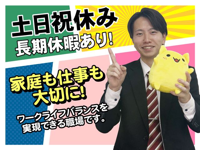 【保険制度】 雇用保険、労災保険、健康保険、厚生年金 待遇 ・社会保険完備 ・各種手当(役職手当、住宅手当、配偶者手当、家族手当)※規定あり ・昇給年1回(業績による) ・賞与年2回(業績による)※決算賞与実績あり ・営業報奨金 ・交通費規程内支給 ・駐車場完備 ・社用車貸与 ・ノートパソコン貸与 ・スマートフォン貸与 ・有給休暇(1時間単位で取得可能) ・産休、育休 ・退職金制度 ・定期健康診断 ・年間表彰制度