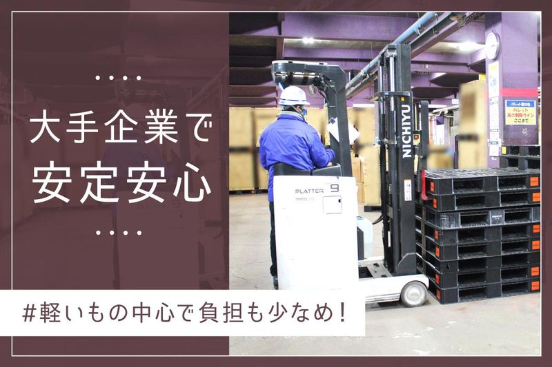 職場環境 <大手企業なので安定で福利厚生充実> <賞与が年2回あるので嬉しい!> <お休みの希望にも応じます!> 資格取得期間もしっかり給与支給します。 軽い雑貨などを取り扱うので安心。 基本フォークリフトの運転でOKです!