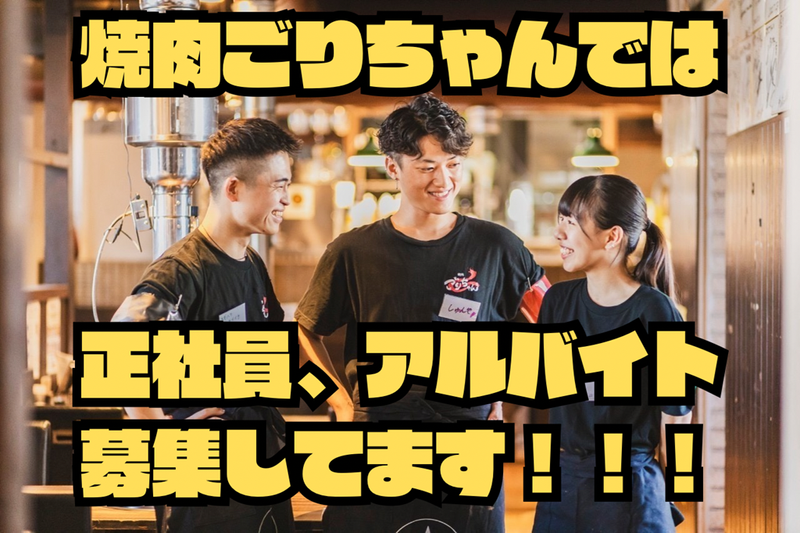仕事内容 社員平均年齢24歳?! 若いからこそ楽しみながら本気で頑張れる! 一緒に成長していきませんか☆ 「焼肉が好き」 「人と話すのが好き」 それだけで、スタート資格は十分!! 「仲間と声を掛け合いながら!」 「忙しいほど楽しくなるチームワーク」 働くたびに、自分も成長する! そんな経験ができるのが、焼肉ごりちゃんです! ・ホール接客業務 基本的には、注文お伺い・配膳など。 他にも洗い場作業などもありますが 大切なことは、笑顔でお仕事ができること! もちろん、未経験スタートでも大丈夫! 物覚えが実は悪くて自信がない方でもOK! 人とのコミュニケーションをとるのが 好きな方にピッタリ!っていうかうちのお店の スタッフは皆、話をするのが好きな子ばかり(笑) 仕事のことや恋愛のことや学校のことなど 他愛のない話でめちゃくちゃ盛り上がれる職場です! ・キッチン調理補助業務 カンタンな盛り付けなどの料理補助。 料理をしたことがないんです!って方も 今ではもう料理人みたい(笑) イチからでも大丈夫だから安心ください! うちのお店で作れるようになったら 実は、子どもに自慢できる 美味しいゴハンが作れたり 彼氏や彼女に喜んでもらえる料理が作れたり お母さんが涙して食べてくれる 美味しさだったり色んな所で 役立つお仕事です(笑) 簡単なお仕事だからスグに覚えられます! 就職活動にも活かせるので 学生さんにとっては嬉しいです! フリーターさんも掛け持ちや WワークOKだから安心です! パートさんも子育てや家事と 両立できるから大丈夫! 社会人の方の副業としてもOK! 正社員希望の方もご応募お待ちしてます! 人柄重視で積極採用中! ちなみに、当店でバイトできるって 激レアバイトかも(笑) 友達にも家族にも胸を張って 自慢できるお店ですよ! 新店も今後オープン予定! オープニングスタッフとしても 頑張れる環境もあります! 履歴書なんかなくても応募してください! あとで、くださいって、、、 言うかもしれませんが(笑) - 大切なことは 「バイトを楽しむ気持ち」。 そして、 「お客様をおもてなしする気持ち」。 1つ1つの仕事を丁寧に 行って行きましょう! SNSで有名なグループの 新店オープニングスタッフとして 働けるチャンス!激レアバイト! 人を大切にする会社です! 梅田・難波を中心に 外食産業NO.1を目指す お店を出店中の「ごりちゃん」 これからは全国各地に進出! 九州や東京にも拡大予定! 大阪で一番の飲食店から 日本で一番の飲食店へ! 今後も新店を展開します! 居酒屋で働いたことがある方! 焼肉屋さんが大好きな方! 韓国料理に興味がある方! 韓国居酒屋でバイトしたい方! など、皆さん大歓迎!