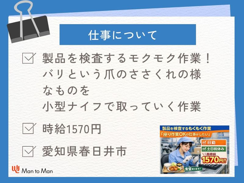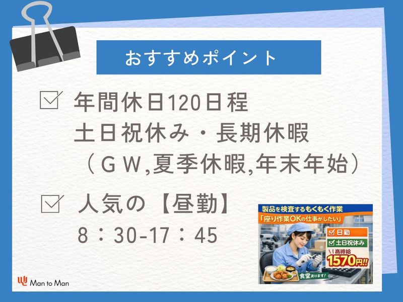 求める人材: 【応募資格】 未経験OK 特別な知識・スキルは一切不要です。 未経験からスタートした方が半数以上! Man to Manでは他にも以下の様なスタッフさんが活躍されています。 ・アルバイト/パートからの転身の方。 ・短時間勤務からフルタイムに切り替えたい方。 ・工場でのお仕事に興味がある方 ・製造業や事務職にチャレンジしたい方 ・学歴不問の職場で働きたい方 ・介護をしながら働きたい方 仕事に対してこんなお悩みありませんか? ・日勤の固定勤務で働きたい。 ・土日祝休みの職場で働きたい。 ・交通費支給の職場で働きたい。 Man to Manには、 ハローワークや一般求人誌には掲載されていないお仕事情報もたくさんありますので、 まずはお気軽にお問合せください。