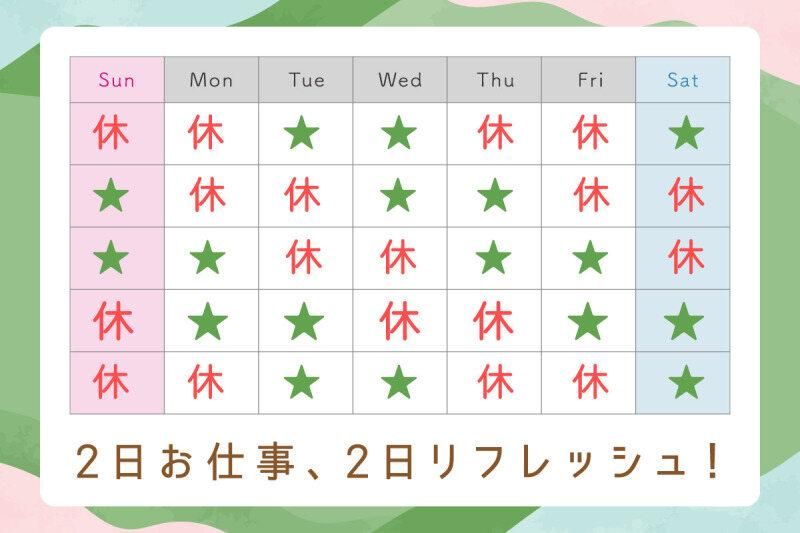勤務時間詳細 総労働時間:1週あたり40時間 ━━━━━━━━━━━━━━ ✅ 2勤2休/人生を「効率化」するログイン時間 ━━━━━━━━━━━━━━ 自分のプレイスタイルに合わせて、 参戦する「ステージ(部署)」を選択可能! ※面接で希望のクエスト (職種)を教えてください。 ■各ステージの作戦時間 ──────────────── 【盛付】10:30~23:00 ┗ 通勤ラッシュを 回避するデイタイム攻略 【調理】07:00~19:30 ┗ 早起きして 夜の自由を確保。先行逃げ切り型 【検収】18:30~翌07:00 ┗ 静かな夜に 集中して稼ぐナイトミッション (実働11時間/休憩1.5時間) ■ここが「攻略」ポイント! ──────────────── ★2連勤以上はなし! 2日全力で攻略 →2日完全オフの神サイクル。 ★無駄な時間はカット! 着替えや移動も 「クエスト時間(勤務時間)」に 含まれます。準備中も 報酬が発生する合理的なシステムです。 ★変形労働時間制(週平均40時間以内) 1日の密度をギュッと上げることで、 年間休日180日 (年の半分が休み)を生成。 プライベートの時間を 最大化したい「効率厨」な あなたに最高のスケジュールです。