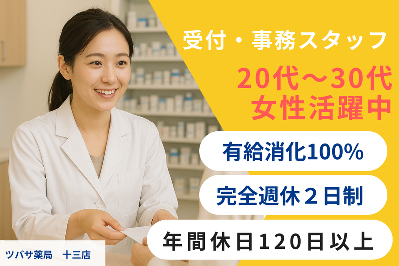 仕事内容 未経験OK! \調剤薬局の受付・事務スタッフ♪ / =================== ◆ 経験・学歴は一切不問! ◆ 年間休日120日&有給消化率ほぼ100% ◆ 完全週休2日制で働きやすさ抜群 ◆ 大阪・京都・兵庫で展開する安定企業 ◆ 三国駅から徒歩11分、アクセス便利! =================== ◆――― お仕事内容 ―――◆ 透析病院の近くにある 「ツバサ薬局 十三店」で、 患者様対応や受付事務をお願いします。 【具体的には…】 ・患者様の受付・ご案内 ・データ入力などの簡単な事務処理 ・電話応対やレセプト作成補助 ・薬剤師のサポート業務 など ★未経験でも安心! 先輩スタッフがイチから丁寧に教えるので、 初めての方も安心してスタートできます。 ◆――― 働く環境 ―――◆ ◎20代~40代の女性スタッフ多数活躍中 ◎薬剤師6名・事務4名が在籍 ◎アットホームで温かい雰囲気の職場 ◎地元の方に長年愛される地域密着型薬局 ◆――― ここが魅力 ―――◆ ◇ 年間休日120日!日祝+平日1日休み ◇ 有給休暇はほぼ100%消化! ◇ 残業は少なめ&変形労働時間制で調整 ◇ 社長面談でキャリア相談も可能 ◇ 事業拡大中!安定した環境で長く働けます