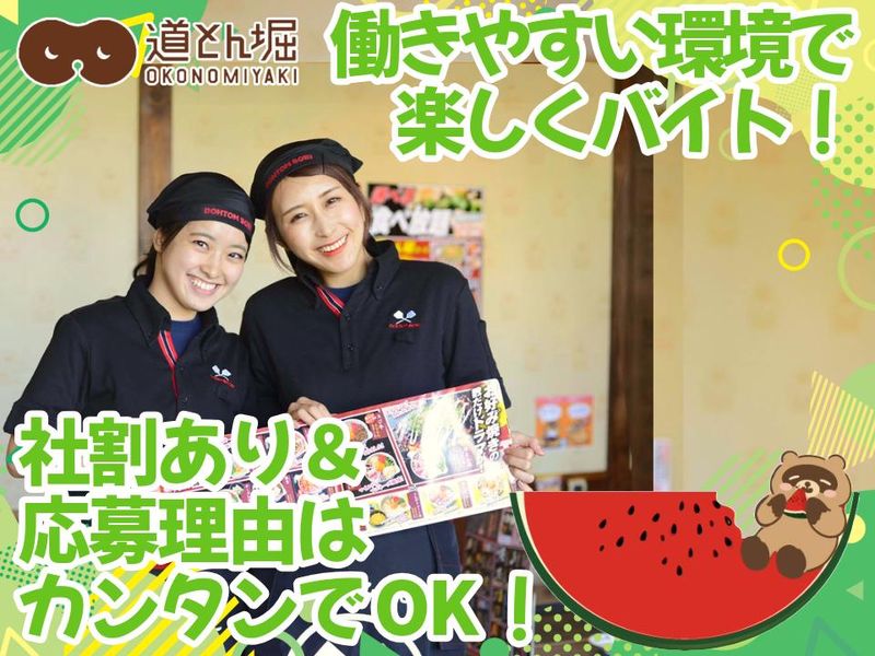 仕事内容 【新着】アルバイト・パート募集! ˚✧₊⁎ ⁎⁺˳✧༚˚✧₊⁎ ⁎⁺˳✧༚˚✧₊⁎ ⁎⁺˳✧༚ ✨主婦(夫)・フリーター活躍中! ✨嬉しい社割&交通費支給♪ ✨車・バイク通勤OK、無料駐車場あり! ˚✧₊⁎ ⁎⁺˳✧༚˚✧₊⁎ ⁎⁺˳✧༚˚✧₊⁎ ⁎⁺˳✧༚ 《ホールスタッフのお仕事》 ・開店準備 ・席へのご案内 ・オーダー取り ・ドリンクやお料理の提供 ・テーブルの清掃 ・レジ業務 ・焼き方の説明 など \初バイト&未経験者歓迎!/ まずは簡単なことから、丁寧にお教え! 少しずつ覚えていけばOKです! お好み焼きなどの焼き方研修もあって安心◎ \応募理由は簡単でOK!/ 「働きやすそう」「家から近い」 「稼ぎたいから」などでOK! 自由な雰囲気のお店です。 お気軽に応募してください! 面接では週何日希望や勤務開始希望日など、 カンタンな質問のみなのでご安心を! 《道とん堀のご紹介》 HP:https://dohtonbori.com/ お好み焼き、もんじゃ焼き、鉄板焼き、 パンケーキなどのおいしいメニューが人気! ほぼ全てのお客様がセルフでお好み焼きを焼くので 従業員への負担も少ないです◎ 上手く焼けた時はお客様も喜んでいますよ!