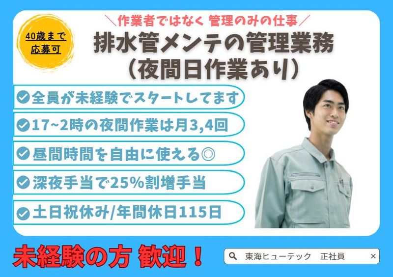 仕事内容 \\ ⭐この求人のポイント⭐ // ***************************** ✅未経験歓迎!全員が未経験スタート◎ ✅”作業者”というよりは、 ”管理側”がメインのお仕事 ✅年間休日115日×土日祝休み ✅月平均残業時間は10H程度と少なめ ✅原則定時退社◎ ✅家族手当・育休・育児時短制度◎ ✅介護休暇・介護時短制度◎ ✅会社負担の資格取得支援制度あり◎ ✅ライフラインを守るお仕事◎ なくならない業界×安定して働ける ✅月3,4回程度の夜間作業あり └17~2時・翌日は明け休み ✅深夜手当で25%割増✨ ✅実は夜勤って良いところも✨ └夜勤明け当日はお休み◎ └昼間時間を自由に使えてプライベー トも充実! ⭐仕事内容⭐ ──────────────── 商業施設や大型建築物の排水管の 定期清掃・メンテナンスなど、 当社請け負い現場での協力会社の 管理業務をお願いします。 ※”作業者”というよりは、 ”管理側”がメインのお仕事です。 ⏩具体的には ・・・  ̄ ̄ ̄V ̄ ̄ ̄ ̄ ̄ ̄ ̄ ̄ ̄ ̄ ✅現場調査 担当する現場へ赴き、協力会社の作業状況を 確認、手順や品質のチェックをします。 ✅既存顧客フォロー お取引のあるお客様へ訪問し、進捗状況の 確認や新たなニーズがないかなど伺います。 ✅成果報告書のまとめ・見積り作成 現場調査の成果報告を取りまとめます。 また、お客様からの依頼に基づき、見積書を 作成します。 ┈┈┈┈┈┈┈┈┈┈┈┈┈┈┈┈┈┈┈┈ ⭐未経験でも安心の環境⭐ ┈┈┈┈┈┈┈┈┈┈┈┈┈┈┈┈┈┈┈┈ ✅全員が未経験からのスタート! 印刷業や製造業からの転職者も 活躍しています◎ ✅最年少メンバーは24歳! ✅OJTもありますので、35年の歴史がある 当社ならではのノウハウをしっかり伝授◎ ✅会社負担での資格取得支援制度あり! キャリアアップをサポートします◎ ▼▼この仕事の特徴▼▼ ✨生活に欠かすことのできない 水の供給や排水設備がしっかり機能し、 清潔で快適な生活が送れることを 守るのが私たちの使命です。 ✨人による目視チェック・作業が必要な 仕事のため、今後、自動化・機械化が 進んでも安定した受注が見込める仕事です。 ┈┈┈┈┈┈┈┈┈┈┈┈┈┈┈┈┈┈┈┈ ⭐夜勤と「明け休み」の嬉しい関係⭐ ┈┈┈┈┈┈┈┈┈┈┈┈┈┈┈┈┈┈┈┈ 月に3〜4回程度、夜間作業(17:00〜翌2:00頃)が発生します。 「夜は大変そう…」と思うかもしれませんが、実はメリットも豊富! ✅深夜手当で効率よく稼げる(25%割増✨) ✅夜勤の翌日は「明け休み」でしっかり休める! ✅昼間の時間を自由に使えるため、役所や銀行の用事もスムーズ! 生活リズムを崩さないよう、配慮したシフトを組んでいます。 ┈┈┈┈┈┈┈┈┈┈┈┈┈┈┈┈┈┈┈┈ ⭐会社の特徴⭐ ┈┈┈┈┈┈┈┈┈┈┈┈┈┈┈┈┈┈┈┈ ✅長野県に本社を置く 株式会社インフラクリエイトグループの グループ会社です。 ✅「公共事業」と「民間施設」の 環境維持・管理事業で地域社会に貢献! ✅グループ全体で社会インフラ計画や 調査・設計・施工・維持管理まで行い、 暮らしと自然環境を支えてきました!