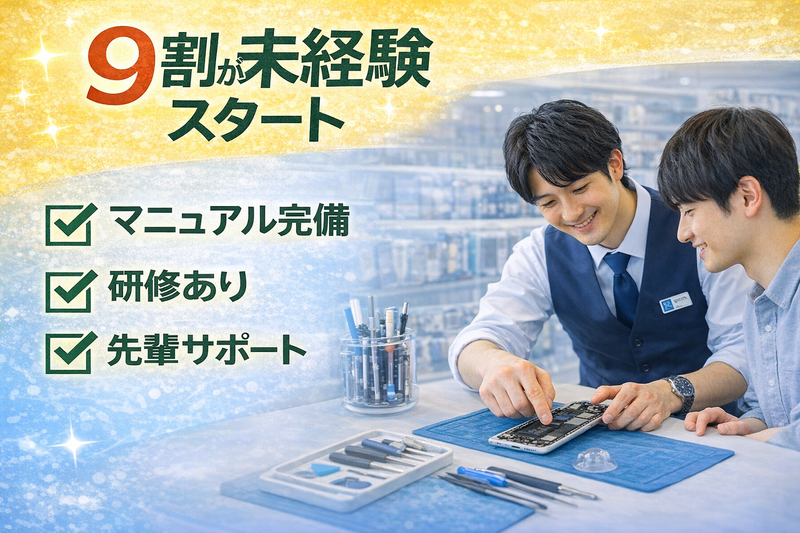 スマホ修理に関する知識0でもOK!|未経験OK|月給30万以上可能|社割あり|残業少なめ|住宅手当あり|資格取得支援あり