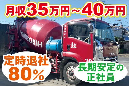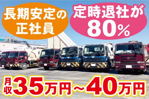 仕事内容 新着:大型ドライバー正社員 生コンクリートや建材・資材の出荷・ 輸送部門で大型ドライバー正社員募集! 【ポイント】 ・大型免許があれば未経験歓迎 ・日勤のみ ・残業ほぼナシ!17時の退社可能! ・土日祝休み ・長期休暇(GW・お盆・年末年始)もあり ・資格取得支援あり ・牽引免許がある方は手当あり ・30代~50代が活躍中 ・入社日や勤務スタート日の相談OK <大型ドライバー業務> 生コンクリート、建材や資材を 大型のミキサー車やダンプトラック・ トレーラーなどで出荷・輸送します。 配送先は1日3~4件程度で1時間程度の近距離エリアです。 教育・安全研修をしっかり行います。 輸送管理システムの導入により、安全で 迅速な輸送が可能です。 30代から40代・50代の中高年も活躍中! ◆大型免許があれば未経験者も歓迎 ・大型を取得したばかり ・ドライバー業務からブランクがある ◆経験者も大歓迎! 土木や建設業界の他に、物流や運送 業界での大型トラック運転手・ 長距離配送・タンクローリーなどの 経験者も大歓迎! パート・アルバイトから正社員を 目指す方のチャレンジも応援します。 ◆資格取得支援あり 牽引免許を取得してトレーラーなどの 乗務を目指すなど、スキルアップや ステップアップも目指せます。 【働きやすい勤務形態】 日勤のみで夜勤や夜間配送はありません。 残業ほぼナシで17時の定時退社が可能! 土日祝休みでGW・お盆・年末年始の 長期休暇もあります。 プライベートや家族の時間を大切に! という方にもオススメです。 当社は埼玉県鶴ヶ島市で生コンクリートの 製造からリサイクルまでを行っています。 大型整備工場を完備し、定期的な車両の メンテナンスができ、安全体制もしっかり! 関越自動車道・圏央道に隣接し、主要な 幹線道路へのアクセスも良い立地です。 まずはお電話または応募フォームより ご連絡ください。 ご不明な点などのお問合せも歓迎です。 TEL/049-285-5100