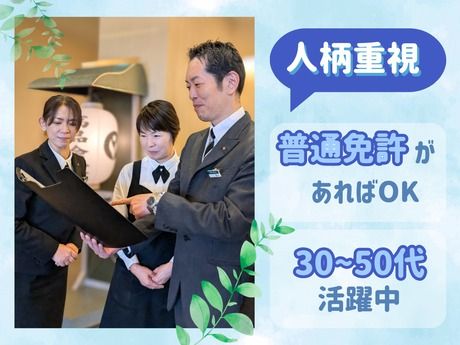 資格 【必須】 普通自動車免許(AT限定可) 【歓迎】 ホテルなどで接客経験のある方 【職員へのアンケート】 Q.お仕事でのやりがいは何ですか? 女性職員:ご葬儀を通じて関わったお客様からダイレクトに感謝の言葉を頂けることが最もやりがいに繋がります。 男性職員:お客様に誠心誠意寄り添うことで短期間のお付き合いであっても名前を覚えて頂けたり、直接御礼を伝えて頂ける瞬間がこの仕事のやりがいです。 Q.職場の雰囲気はどうですか? 女性職員:ご葬儀や接客中は気を引き締めて対応していますが、それ以外はフランクな雰囲気で和気あいあいとした職場です。 男性職員:相談しやすい雰囲気の職場であり、上司も常に気にかけてくれるので安心して業務に取り組むことができます。 Q.入社後の指導についてはどのように行われますか? 女性職員:新人社員には一人ひとりに先輩社員が教育担当として付いてくれ、丁寧に作業を教えてくれました。業務の習得状況に応じて徐々に独り立ちをしていきます。 男性職員:初めての業界でしたが、葬儀の基礎知識から接客スキルまで先輩社員がしっかりと教えてくれます。