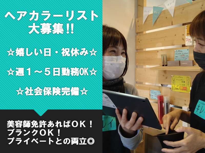 仕事内容 ▼∴▼∴▼∴▼∴▼∴▼∴▼∴▼∴▼∴▼ オシャレな白髪染め専門店キレイ ひたち野うしく店 / 【美容師免許】保有者を募集! ✨主婦・主夫さん歓迎&活躍中!✨ \ ▼∴▼∴▼∴▼∴▼∴▼∴▼∴▼∴▼∴▼ \\\アピールポイント!/// ゜+.――゜+.――゜+.――゜+.――゜ ⭐子育て中の主婦・主夫さん活躍中! ⭐週5勤務の場合、月給24万円も実現可能◎ ⭐1日4時間~勤務OK♪ ⭐業界では珍しい日曜・祝日休み♪ └残業なしでプライベート時間も充実 ⭐美容師ブランクのある方でもOK◎ ゜+.――゜+.――゜+.――゜+.――゜ |◤ 具体的な仕事内容 ◢|  ̄ ̄ ̄ ̄ ̄ ̄ ̄ ̄ ̄ ̄ ̄ ̄ ̄ ̄ ̄ ̄ ̄ ̄ ̄ ̄ ✅お客様のご要望をヒアリング ✅白髪染めの施術 ✅シャンプー ✅トリートメント ✅カラー剤の在庫管理・発注 ※他店舗もあり。 (阿見店、龍ヶ崎店) お客様の髪質や希望に合わせた カラーリングを提供し、施術中は お客様とのコミュニケーションを 大切にしています★ リラックスした時間を作ることを 心がけていただける方を歓迎! *‥‥*‥‥*‥‥*‥‥*‥‥*‥‥* ⭐主婦さん・主夫さんが安心して 働ける環境をご用意しています⭐ *‥‥*‥‥*‥‥*‥‥*‥‥*‥‥* / 家庭と両立しながら 働ける環境が整っています! \ 子育て中の方や家事とのバランスを 大切にしたい方も無理なく勤務できます♪ ⏩週1日~OK◎ ⏩9:00~17:00の間で相談可✨ ⏩日曜・祝日がお休み♪ ⏩残業もほぼなし! 家族との時間をしっかり確保できることも 魅力の一つです。 勤務日数や時間も柔軟に相談できるので、 ライフスタイルに合わせた働き方が 可能ですよ◎ ◤ ̄ ̄ ̄ ̄ ̄ ̄ ̄ ̄ ̄ ̄ ̄ ̄ ̄ ̄ ̄ ̄ ̄ ⭐美容師免許をお持ちであればOK!⭐ __________________◢ 美容師免許をお持ちの方であれば、 ブランクがあっても すぐに現場で活躍できる環境です! カットやパーマの施術はなく カラーに特化しているため、 技術面での不安も少なく 経験を活かしながら安心して働けます♪ また、入客数に応じた時給アップ制度もあり スキルを活かして、しっかり収入に つなげることができます◎ ⏩当サロンの特徴  ̄ ̄ ̄ ̄ ̄ ̄ ̄ ̄ ̄ ̄ ̄ ̄ ̄ ̄ ̄ ̄ ̄ ̄ ̄ ̄ <<カット・パーマなし>> 白髪染め専門なので技術に 不安があっても安心◎ <<ブロー不要>> お客様がセルフブローするため ブロー技術は不要! <<ブランクOK>> スタイリスト経験にブランクがあっても 活躍できます✨ <<残業ほぼなし>> 店舗によっては最終受付が 15時〜16時で、早めの帰宅も可能♪ ★.──────────────.★ \先輩スタッフからメッセージ/ <当社で美容業界に復帰した 女性スタッフからお話を伺いました!> ★.──────────────.★ 結婚・出産で一度美容業界を離れましたが 当サロンで無理なく復帰できました! 以前は週5勤務&残業で 家のことが手につかず…。 でも今は、好きなカラーの仕事を 続けながら、家族との時間も 大切にできています✨ 「もう一度、美容の仕事がしたい」 そんな方に、ぜひこの環境を 知ってほしいです! ⏩代表:中島からのメッセージ  ̄ ̄ ̄ ̄ ̄ ̄ ̄ ̄ ̄ ̄ ̄ ̄ ̄ ̄ ̄ ̄ ̄ ̄ ̄ ̄ 現役美容師として、スタッフと一緒に 現場で働いています! 独立のきっかけは東北の震災。 「人生は一度きり、好きなことをやろう」 と決意しました。 当サロンでは主婦の方が多数活躍中! 家族との時間を大切にしてほしいという 思いから、日・祝休み&残業なしの 働き方を実現しています。 「美容の仕事を続けたいけど、 家庭も大事にしたい」 そんな方にぴったりの環境です◎