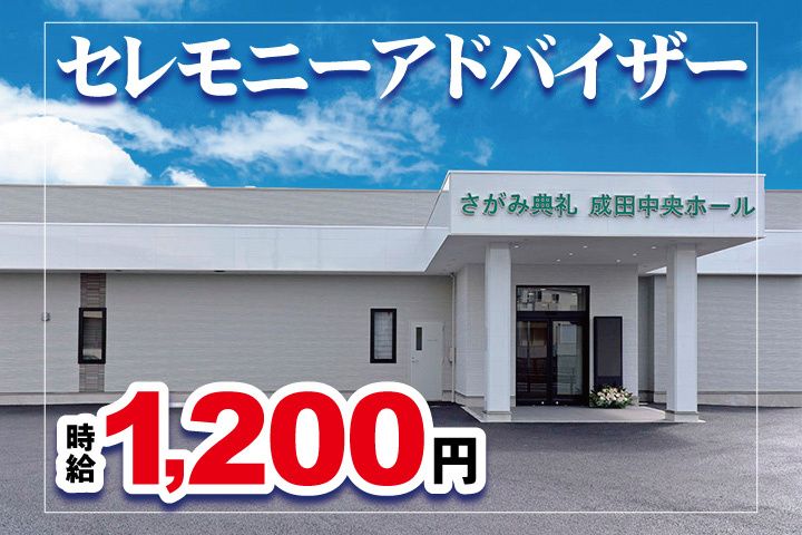 仕事内容 まだまだOPENしたて!11月1日にOPENしたばかり 【さがみ典礼銚子ホール】オープニングスタッフ募集! パート募集!景気に左右されないこの業界で働きませんか? さがみ典礼家族葬ホール 冠婚葬祭場にて働くセレモニーアドバイザーのアルバイト・パートさん大募集! 葬儀・葬祭等の前知識なしで始められる未経験歓迎のお仕事です。 セレモニーアドバイザーのポイント 〇勤務時間・日数が相談できるアルバイト・パート →週3日~OK! 〇葬儀・葬祭等の知識不要!冠婚葬祭業界未経験OK 〇主婦主夫/パートさん歓迎 〇50代~70代とシニア世代・中高年の方も活躍中 〇景気に左右されない冠婚葬祭業界 セレモニーアドバイザーの仕事内容 葬儀・葬祭や結婚式における 〇お手伝いならびに相談・受付 冠婚葬祭業未経験OK 葬儀・葬祭や結婚式の難しい知識や資格・経験等必要ありません! 入社後にしっかりとした研修があるので、葬祭業未経験の方もご安心ください。 当社なら未経験でも気軽にスタートできる環境が整っています。 主婦パートさんも働きやすい 働くシングルマザー・主婦パートさんのサポート体制万全 〇勤務時間・日数相談OK 〇平日休みもOK 〇お子様の学校行事や急な病気でのお休みOK その他、ご相談等あればお聞かせください。 子育てしながら働くって大変ですよね。現在、当社では同じような境遇で働いている主婦パートさ んがたくさん活躍しています。仕事と家庭を「両立」したいそんなアナタの希望を叶えます。 中高年・シニア・年金受給者の方も活躍中 50代~70代のシニア世代や中高年の方もイキイキと働いています。 空いた時間を有効活用したい方や、まだまだ現役で働きたい定年後の方にもおすすめです。 成田市・富里市・香取市・八街市・銚子市のほかにも通勤しやすい勤務地のご相談も可能です。 ご質問等はお気軽にお問合せください。 TEL.0476-33-6675