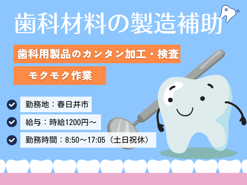仕事内容 お急ぎの方はこちらにお電話ください! ▶080-3068-9375(担当携帯) SMSでの問い合わせもOKです◎ \モクモク作業/ 歯科用製品のカンタン加工・検査など♪ 未経験OK◎空調完備で快適!土日祝休み◎ 【お仕事内容】 歯科用材料の製造工場でのお仕事です! ▼主な作業は… ・トリミング(成型・カット・検査) ・印字(機械で製造日などを印字) ・接着(機械で治具をくっつけるだけ!) ⇒ どれもカンタンな作業ばかり! ⇒ しっかりサポートするので未経験でも安心◎ ※衛生服に着替えての作業になります(制服一式貸与)