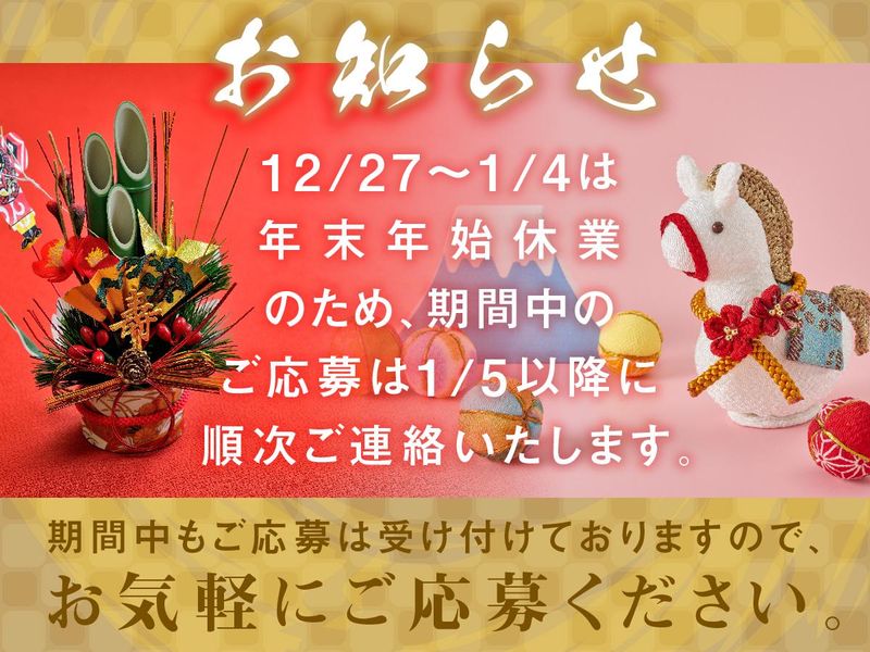 選考プロセス <WEBでのご応募> 24時間、応募受付中! 必要事項を記入のうえご応募下さい。 担当者よりご連絡させて頂きます。 <お電話でのご応募> 「広島の広告を見ました」 と言って頂けると スムーズにおつなぎできます。 お電話がつながりにくい場合は WEBよりご応募ください。 <選考について> 勤務地近くの会場で面接会を開催します! 詳細はお気軽にお問い合わせください。 日程が合わない方もご相談に乗ります♪ 。・☆――――――――――――――― ✋年末年始の応募対応について✋ 12/27~1/4は年末年始休業のため、 応募受付後のご連絡は1/5以降、 順次ご案内いたします。 期間中もご応募は受付中! お気軽にご応募ください。