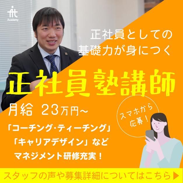 仕事内容 小・中・高校生を対象にした個別指導。生徒さんひとりひとりの目標やペースに合わせて、解答を出すまでの考え方を共有したり「じっくり」向き合うお仕事です。 株式会社フィットアカデミーは「人が財産」。その言葉通り、様々な研修が充実しています。コーチング・ティーチング、キャリアデザイン、マネジメント等の研修を通して得た学びを「教室」をお任せすることでアウトプットする場となります。 教えることは学ぶこと。ひとりひとりと向き合い、自分自身のスキルや経験を大切に成長をしてほしいと考えています。教室運営全般を任されることにより、自己成長のスピードは格段に上がります。もちろん、できないことは任せません。 週2回のミーティング等を通し「チームで働く」体制があるので安心して働くことができます。 【お任せする仕事】 地域のお子さまの教育などに携わるお仕事です。やりがいは、生徒さんの成長。「出来なかった問題が解けた!」「志望校に合格した!」そんな生徒さんの喜ぶ顔が、あなたのやりがいに繋がります。また、アルバイトスタッフさんの指導や教育もお願いしています。 【わたしたちが大切にしていること】 私たちは、試験の点数だけではなく子どもたちの「できた!」と「くやしい!」に日々、真剣に向き合い続けてきました。 それは、子どものころの経験が、大人になっても自分を大切だと認める気持ち(=自己肯定感)や、きっとできると自分を信じる気持ち(=自己効力感)に繋がると言われているからです。 ひとりひとりの子どもたちと向き合い、共に成長することで社会の未来にも繋がると考えています。