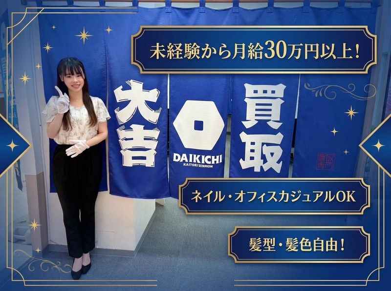仕事内容 ✅スタッフ平均年齢36歳!女性スタッフ多数活躍中! ✅20~40代の女性が中心の落ち着いた職場環境♪ ✅ネイルOK・オフィスカジュアルOK!自分らしさを大切に働けます! ✅未経験スタートでも月給30万円スタート! 当社は全国に約1700店舗以上を展開する『買取 大吉』のFC運営を行っています。 今回は、宮城県内3店舗目の新店舗オープニング募集!2026年3月12日にオープンしたばかりです! ブランド品・貴金属・ジュエリー・時計等の買取・販売を行う正社員募集です。 応募前に条件や仕事内容などの確認もお気軽にお問い合わせください♪ 「080-3655-2605 採用担当:荒井」まで! 未経験の方でもイチから知識をつけられるのでご安心ください♪ ネイル&オフィスカジュアルでの勤務OKです! 「収入を上げたい!」「店長を目指したい!」って方には、2025年も5店舗を新規出店予定の当社がピッタリです! 将来の店長候補を大歓迎します! 【おもな仕事内容】 ・売却(処分)希望で来店された方への接客対応(1日3~7件程度) ・商品の査定業務(AI査定がメインとなりますので、お品物をスマホのカメラで撮り、SNSにて取引先に送信する簡単な業務です) ・客層は60代以上の方がメインで女性のお客様が多いのも特長です。(コレクターさんや不用品を売却したい一般の方) 【入社後の流れ】 入社後は、査定業務に関する知識や『買取 大吉』の研修を受講していただきます。 その後、オープンまで当社が運営する「ザ・ビッグ鹿島台店」または「ウジエスーパー佐沼本店」にてOJT研修を行い、店舗オープンにあわせて配属となります。 研修では買取接客や店舗運営のノウハウを店舗実務の中で学んでいきましょう! 入社6ヶ月~9ヶ月程度で一通りの店舗業務をこなせるようになります。 【収入アップ可能】 社歴や年齢に関係なく、日々の業務に対する姿勢や実績を評価します。 店舗の買取実績に応じたインセンティブは毎月支給があり、月給にプラスして収入アップすることも可能です! 【新規出店予定】 『買取 大吉』のFC店舗運営を始めてまだ日の浅い当社ですが、埼玉・大宮氷川参道店を皮切りに、フォレストモール新前橋店、MEGAドン・キホーテUNY本庄店、ザ・ビッグ鹿島台店、セキチュー花園インター店、ウジエスーパー佐沼本店、ヤオコー大宮上小町店・ヤオコー大宮宮原店、とりせん太田下田島店、とりせん渋川店、MEGAドン・キホーテUNY 会津若松店(2026年3月下旬オープン予定)、浦和店(仮称・2026年4月オープン予定)、そして今回募集するイオンタウン柴田店(2026年3月12日オープン)と全13店舗まで展開を予定しています! 今後もさらなる事業拡大と新店舗オープンを計画しており、勢いにのる事業です! 私たちといっしょに新規事業を進めていきませんか? ★「稼ぎたい」とお考えの方にピッタリの毎月インセンティブあり!(2025年度実績:10~22万円) ★買取業務未経験の方でも充実の研修でスピーディーに学ぶことが可能! ■当社は元々、医療関係の事業をメインとしており、社内ベンチャーとして今話題のSDGsリユース事業に参戦しました。 「人の健康だけではなく、地球の健康のために何ができるか!?」という理念の下、新事業部を発足しました。 社長との距離が近いため、結果に応じた評価を受けやすく、意見を通して新しい制度の導入も可能です!