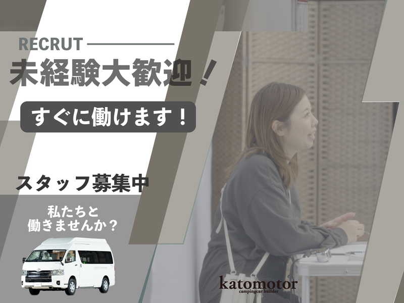 仕事内容 ▼働きやすい理由&魅力▼ ・未経験スタートの先輩が100%在籍 ・飛び込み営業やノルマは一切ありません ・賞与年2回支給、昇給制度あり ・社員食堂やクリスマスケーキなど福利厚生が充実 ・無料駐車場完備でマイカー通勤も安心 ≪業務内容≫ 展示場での接客や、事務作業など、キャンピングカー販売に関する業務全般をお任せします。まずは簡単な事務作業からスタートするのでご安心ください。 ↓↓ ▼ 具体的なお仕事 ▼ ・来店されたお客様の接客、ご案内 ・メールや電話でのお問い合わせ対応 ・自動車の登録に関する事務手続き ・イベント出店時のブース対応 ・販売促進資料の作成サポート >>>経験ゼロでもこれで安心 1|まずは簡単な事務作業からスタート。 2|先輩社員が丁寧に業務を教えます。 3|分からないことは何でも聞ける環境です。 4|いきなり接客はお願いしません。 ⇒あなたのペースで少しずつ業務を覚えていきましょう。 【この環境で働く魅力など】 01.│「未経験からキャンピングカーのプロへ」 → 未経験からスタートした先輩ばかりなので、あなたの気持ちに寄り添って丁寧にサポートします。車に詳しくなくても、働きながら知識を身につけられます。 02.│「快適な環境で集中して働ける」 → 会社内にクーラーを完備しており、夏場でも快適にお仕事ができます。制服も貸与されるので、毎日の服装に悩む必要もありません。 03.│「嬉しい福利厚生で毎日をサポート」 → 社員食堂では炊きたてのお米が食べられ、昼食代も節約できます。インフルエンザ予防接種や健康診断の費用は会社が全額負担します。 ◉他にはない、ここで働く魅力◉ → 自分の関わったキャンピングカーがお客様の思い出づくりに貢献できること。お客様の喜ぶ顔を直接見られることが大きなやりがいです。