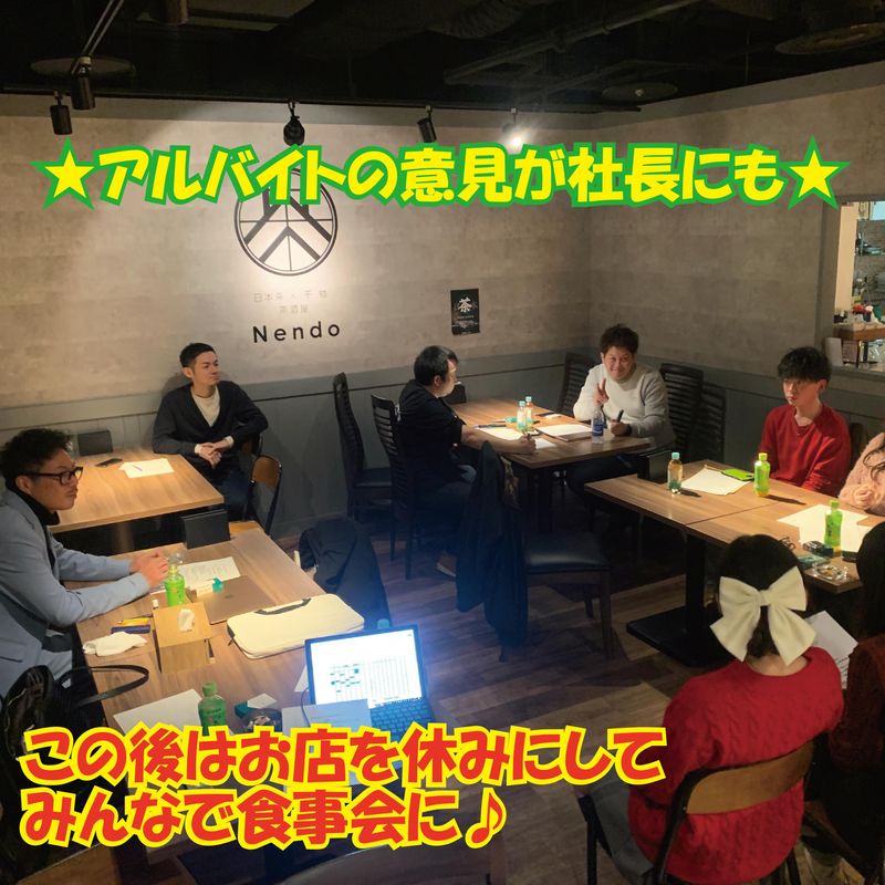 仕事内容 こだわりのメニューに 「茶」を融合させた”茶酒屋”!? 秋には、オータムフェストにも 出店していました✨ がんばって続けてくれていた 学生さんたちが学校の卒業、 そして就職に伴い、 あたらしい仲間を たっくさん募集いたします!!! \ホールスタッフ/ まずは・・・ 「いらっしゃいませ!」 「ありがとうございます!」 をハキハキと言ってみることから スタートしましょう✨ ✅お席のご案内 ✅オーダー取り ✅料理ご提供 社員や先輩アルバイトの サポートからお願いするので、 飲食・接客経験のない方も大歓迎です! \キッチンスタッフ/ ✅仕込み補助(混ぜるだけのタレ作成) ✅慣れてきて、希望がある方には スイーツ作成等もお教えします! ✅お店のオープン後は、 社員が調理メインを行うので、 最終的な盛付だけお任せします! ✅場合によっては、ドリンク対応と 皿洗いをホール・キッチンで協力! ホールとキッチンの兼任も可能です。 「どっちもやりたい!」 なんて方も大歓迎✨ 「今日はキッチン、明日はホール」 といった働き方も可能です! \スタッフにインタビュー!/ ⭐入社2年目のHさん(21歳女性) Q:お仕事していて嬉しいこと、 やりがいを実感できるところは? A:10代~30代の年代が近いスタッフが 一緒に働いているので、 コミュニケーションが 取りやすいところです! Q:つらい・厳しいと感じることは? A:週末はめちゃくちゃ忙しい! 仕事が終わった後は おいしいまかないがあるので、 それを楽しみに頑張ってます!笑 ⭐渡邉店長(28歳) Q:入社したきっかけは? A:19歳の時にオーナーご兄弟と 職場が一緒だったこともあり、 コロナ禍で苦境の飲食店が多い中、 僕を受け入れてくださったのが nendoに入社したきっかけです。 Q:アルバイトさんへ一言! A:一緒に楽しく働いてくれたらいいな! と思います。飲食店アルバイトが 初めてだったというスタッフが9割なので、 初バイトも大歓迎! 【お店について】 全体の席数は50席。 2名掛けのテーブル席から、 4名掛けの個室や 10名掛けの大きなテーブルなど。 少人数のお客様から グループでのご利用にも対応しています⭐ お客様の来店数目安は、平日が40~50名程度、 土日は100名程度にご利用いただいております!
