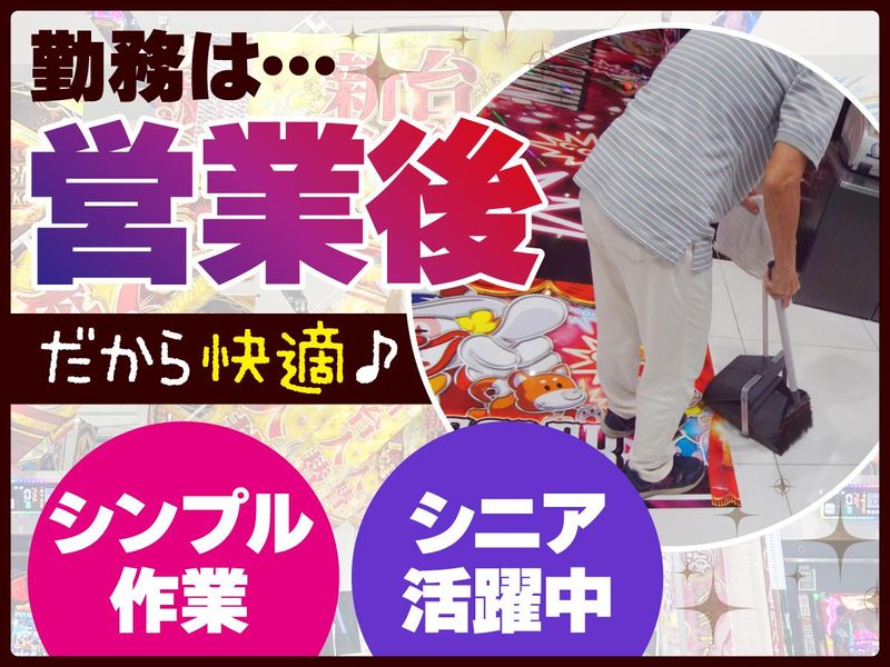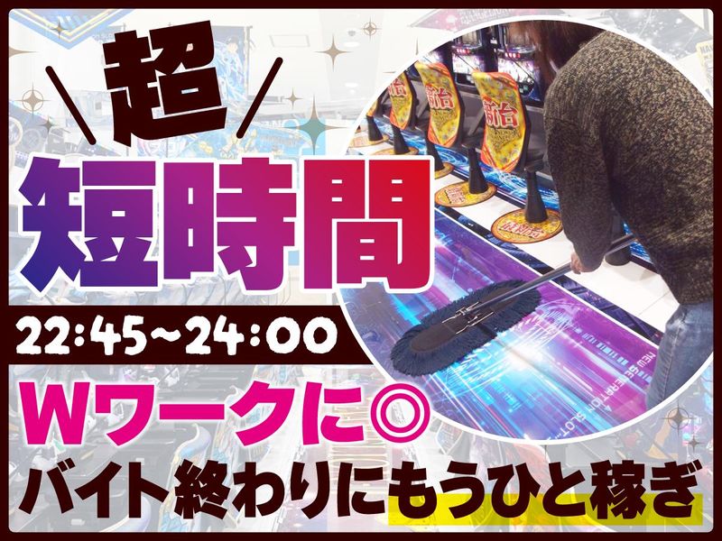 仕事内容 ―・―・―・―・―・―・―・―・―・―・―・―・― ⭐短時間×簡単作業◎シニア活躍中!⭐ ⭐経験不問・年齢不問⭐ 「超」短時間でパッと稼げるので Wワークやスキマ時間に働ける٩(ˊᗜˋ*)و*。 ―・―・―・―・―・―・―・―・―・―・―・―・― パチンコホール内の閉店後清掃をお任せ! 大きく綺麗な店内を分担して作業します。 【業務内容】  ̄ ̄ ̄ ̄ ̄ ̄ ̄ ̄ ̄ ̄ ̄ ̄ ̄ ̄ ̄ ̄ ̄ ̄ ✅床の拭き・掃き掃除(モップ掛け) ✅トイレ掃除 ✅ごみ回収など 簡単でシンプルな作業中心です‼ ※外観などの清掃はありません。 ◎重いものを運ぶ作業なし ◎ローテーションで清掃するので、 同じ場所ばかりではありません ◎未経験の方もすぐ覚えられます! <オススメポイント>  ̄ ̄ ̄ ̄ ̄ ̄ ̄ ̄ ̄ ̄ ̄ ̄ ̄ ̄ ̄ ̄ ̄ ̄ ✔ 短時間でサクッと働ける! ✔ 難しい作業は一切なし ✔ シニア・未経験スタート多数活躍中 ✔ +αでお小遣い稼ぎも◎ ✔お客様がいない時間帯なので 掃除も気兼ねなくスムーズにできる! ⭐夜の1時間ちょっとの時間で サクッと稼げるので、バイト終わりに 働く方もいますよ°˖✧◝(・◡・)◜✧˖° 「夜のちょっとした時間を有効活用したい」 「短時間で無理なく働きたい」 そんな方にぴったりのお仕事です! 年齢や経験に関係なく、 どなたでもすぐに馴染める環境です。 閉店後のパチンコ店って とってもワクワクするんですよ…♪ ぜひ一緒に気持ちよくお店を 締めくくるお手伝いをしませんか?