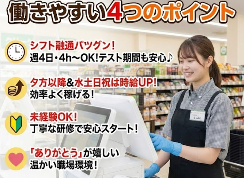 仕事内容 *‥‥*‥ アピールポイント ‥*‥‥* ✨ 「ありがとう」が直接聞ける!地域密着の温かい接客 ✨ レジの操作はシンプルで簡単!機械への不安も払拭 ✨週3日・1日4時間〜相談OK ✨ 夕方以降&水土日祝は時給UPで効率よく稼げる! *‥‥*‥‥*‥‥*‥‥*‥‥*‥‥* ┏────────────────┓ 「ありがとう」が飛び交う温かいお店! レジ操作は、シンプルで簡単♪ 週3日・4h〜OKでシフト融通抜群だから 学生・主婦(夫)さんも両立ラクラク♪ 夕方や週末は時給UPで、 地域に愛されながら賢く稼げます! ┗────────────────┛ ⭐具体的なお仕事  ̄ ̄V ̄ ̄ ̄ ̄ ̄ ̄ ̄ ̄ ̄ ̄ ̄ ̄ ̄ ̄ ̄ ̄ ̄ ラクト山科ショッピングセンター内の地域密着型スーパーマーケットにて、 店舗業務全般をお任せします。 ✅ レジ操作・金銭管理 ✅ お客様への接客対応 ✅ 商品の品出し・陳列 最近は自動精算機なども増えていますが、操作はとてもシンプル! 画面の指示に従うだけなので、レジに触れるのが 初めての方でもカンタンに覚えられます。 ⏩ 業務の流れ ─────────── 【出勤】笑顔で挨拶からスタート!シフトを確認します。 【品出し】まずは売り場を回り、減っている商品を補充。商品名を覚えるチャンスです。 【レジ業務】ピークタイムはレジに入ります。 バーコードをスキャンし、 お客様と「今日はお買い得ですよ」「いつもありがとうございます」 といった会話を楽しみます。 【退勤】業務報告をして終了。残業は精算業務がある場合のみ(20分前後)で、 基本は定時で帰れます! ⭐ 教育体制 ─────────── 現在活躍しているスタッフも、最初はみんな未経験からのスタートでした。 入社後の試用期間(3ヶ月)で、商品の並び場所やレジの基本操作から丁寧にお教えします。 わからないことがあれば、すぐに先輩スタッフがフォローに入るので安心してください。 ⭐ キャリアアップ ───────────── 技能UP・勤務成績等の査定によって昇給制度もご用意しています! 長期的に安定して働きたい方には賞与の支給実績もございます。 ⭐ 採用担当からメッセージ ───────────── 当店は交通の便がよく、働きやすい施設に入っています。基本は曜日固定制ですが、 事前にご相談いただければ学校の試験やサークル、 ご家庭の用事などでお休みを取ることも十分に可能です。 コミュニケーションを大切にしており、 「人と話すことがリフレッシュになる」という方には最適な職場です。 ぜひ私たちと一緒にお店の顔として活躍してみませんか?