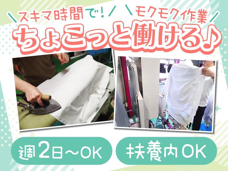 仕事内容 \ コツコツもくもく働ける軽作業! / ✅扶養内勤務OK!サクッと稼げる♪ ✅週2日~OK ✅嬉しい従業員割引あり! クリーニング工場でカンタン軽作業をお任せします♪ スキマ時間で働きたい主婦さんが活躍中! シフト制なので、 家事と両立しながら無理なく働けますよ✨  ̄ ̄ ̄ ̄ ̄ ̄ ̄ ̄ ̄ ̄ ̄ ̄ ̄ ̄ ̄ ̄ ̄ ̄ 《 仕事内容 》 衣類を機械でプレスするなどの 簡単軽作業をお任せします♪ ……………………………… 最初は研修と実践を交えながら 一つひとつ業務を教えていきます。 単純作業の繰り返しになるので、 覚えたら後はカンタンです♪ 慣れるまでは先輩スタッフが近くにいるので、 分からないことはいつでも聞いてくださいね◎  ̄ ̄ ̄ ̄ ̄ ̄ ̄ ̄ ̄ ̄ ̄ ̄ ̄ ̄ ̄ ̄ ̄ ̄ ╭━━━━━━━━━━━━━╮ 接客が苦手な方にもピッタリ ╰━v━━━━━━━━━━━╯ 実務経験や特別な資格は一切要りません! お仕事に対して真剣に取り組む姿勢があれば大歓迎です◎ 工場内でのコツコツもくもく作業なので、1人で集中して働けます! ╭━━━━━━━━━━━━╮ 1ヶ月ごとのシフト制です ╰━v━━━━━━━━━━╯ 私生活や家事・育児と両立できる時短勤務✨ 短時間で働けるから、スキマ時間でサクッとお小遣い稼ぎ! もちろんフルタイムで働きたい方は大歓迎です。