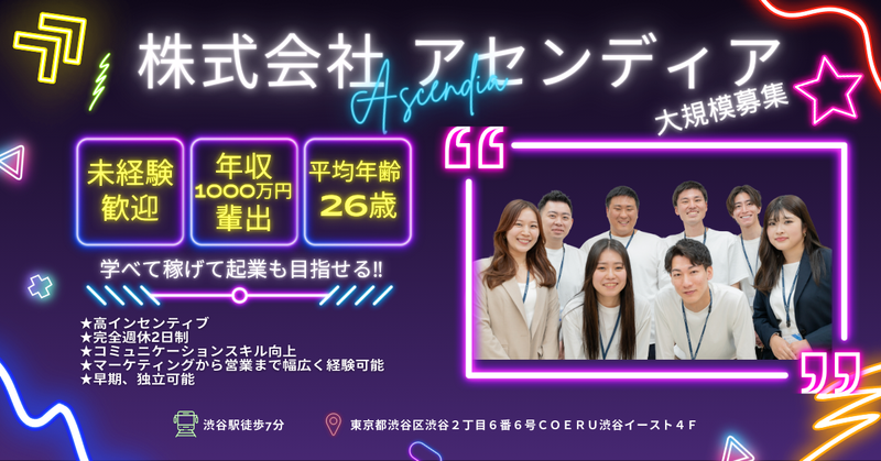 仕事内容 【働く魅力~8選~】 ★月給30万以上 ★高インセンティブ ★完全週休2日制 ★入社1年目で年収600万円可能 ★とても大切な「人間力」が身につく ★マーケから営業まで幅広く経験できる ★起業のノウハウを知れる ★社員寮完備(駅徒歩7分・家具家電付き) 【仕事内容】 昨今、省エネや自然エネルギーが話題となっております。 今回は「太陽光設備導入の事前挨拶」を担当していただきます。 「太陽光設備導入の事前挨拶」の業務♪ ※何か売りに行くお仕事ではなくご周知です! ✅朝は皆んなでモーニング!気分上げていこ! ✅訪問エリア&訪問先の選定 ✅2人1組で訪問(1人じゃない!) ✅良かった所を伸ばすフィードバック 【アセンディアってどんな会社?】 「平均年齢26歳」の成長し続ける若い会社です。 休みたい時に休めるシフト制を導入し、社員一人一人が仕事とプライベートを両立した日々を過ごせるような環境づくりを行っております。 スキルに応じて給料が上がっていき、チャレンジを楽しめる環境で他社様には無い成長スピードを体験し、自分自身の不安が自信変わる最高の環境です。 是非、一緒に僕達と人生を変えましょう! 【仕事の魅力】 「対面で養われる人間力」 デジタルが発展している中、機械には代わりができない人間力を買っていただくお仕事です。 売り込む営業ではなく、買いたいと思って頂くスキルを心理学、世の中の法則を使ってご提案するお仕事です。 ★コミュニケーション能力 →人が生きていく上で欠かせないのがコミュニケーション。 我々はお客様一人一人の表情・声・仕草に合わせて商談を行います。 一般顧客になるので対応方法も人それぞれ、それにも対応できることができます。 家族・恋人・友人のコミュニケーションもスムーズに行え、自分自身で気持ちの良い環境を作れる人になります。 ★課題解決能力 →一般顧客への営業の場合、商品ニーズがないことも多いです。 ただ、我々がご案内するのは電気代高騰対策の中で国が支援を行っている商品になります。 新築時設備導入出来なかったお客様、災害に不安を持ってるご家庭様のニーズを満たせる仕事です。 他の営業と違い、0から1を生む営業なので市場価値は高いです! ★稼げる → 楽に稼ぐという言葉ではなく、弊社では楽しく稼ぐという言葉が合ってます♪ スキルが上がって、人として成長していくことで、契約数が上がり、10万円単位でインセンティブが貰えます♪ スキルを高めて、お金を稼げて、同世代の仲間達と切磋琢磨して仕事が出来る会社です! 独立支援もあるので組織を持って起業することも可能です! 【社員の声】 同世代が多く目標に向かって走っているのは、部活をやっているような感覚に近いですw 苦しいことも楽しいことも仲間とともに成長できる環境でとても楽しくやりがいがあります! 社長との距離も近くなんでも相談できますし「経営の仕方」や「事業拡大の戦略戦術」が学べます! 私も将来は起業することを目標に走っております。 #20代活躍中 #提案営業 #訪問販売 #高インセンティブ #平均年収600万 #20代管理者 #独立支援