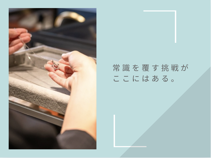 職場環境 まずは新規ジュエリー事業の直営店「ZEUDIAS」の運営を中心に、 既存ビジネスである卸売り業務まで幅広くお任せいたします。 弊社では30代・40代のメンバーが多数活躍しており、 年齢に関わらずキャリアを築ける環境です。