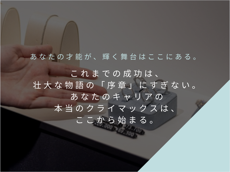 仕事内容 あなたにお任せするのは、 売上目標300億円規模の新しいジュエリー事業を世に広める事です。 これは「店舗運営だけを目的とする店長」の募集ではありません。 将来ジュエリー事業のをお任せできる「事業責任者候補」を探しています。 私たちの挑戦は、とてもシンプル。 「一部の富裕層だけのものだった高級ジュエリーを、 誰もが手にできる価格で届け、新しい文化を創る」 この業界の常識をひっくり返す挑戦の、 中心人物になっていただきます。 【具体的な仕事は…】 ・「どう売るか?」を考え、実行する(事業戦略) ・成功モデルとなる1号店を立ち上げ、全国に広める仕組みをつくる ・この事業を世に広めるためのPRやマーケティングを仕掛ける ・売上/粗利/客単価/回転率などのKPIを自ら設計し、 300億円という目標から逆算して月次・週次・日次の数値計画を立て、実行する ・感覚や経験則ではなく、「なぜその施策を打つのか」を 数値と根拠で説明しながら事業を推進する ・共に挑戦する仲間を集め、数値目標を共有できるチームを自らつくる