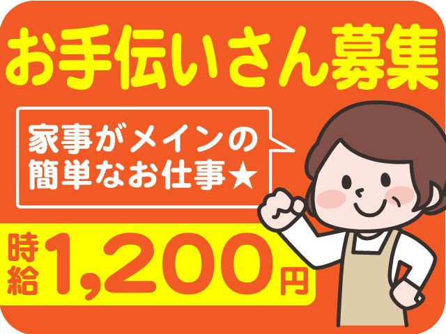 仕事内容 急募!<パート・アルバイト/お手伝いさん> =・=・=・=・=・=・= 会社役員宅での お手伝いさんを募集します! 『40代・50代活躍中!』 家事スキルを活かして 働きませんか? 扶養内勤務OKなので 主婦(夫)さんにもオススメ Wワーク・副業もOKです! =・=・=・=・=・=・= 【募集職種】 パート・アルバイト/お手伝いさん 【勤務地】 高崎市矢中町(会社役員宅) <お仕事の詳細> パート・アルバイト、 お手伝いさんとして、 掃除・調理・洗濯・留守番等の 家事全般をお願い致します。 <<ポイント>>==== 【初心者の方も安心】 丁寧に研修しますので 初心者の方も安心してスタートできます。 今いるスタッフも初めは 未経験の方がほとんどでした。 日常の料理・洗濯ができればOK! 【しっかり稼げます】 時給1,200円、賞与年2回(夏・冬)あり しっかり稼げるのも魅力の一つです 【特別な知識や資格不問】 60代の方が活躍している職場です。 『料理や家事をするのが好き』 『家事手伝いをいつもしています』 『家事スキルを活かしてみたい』などなど あなたの経験をお仕事で発揮してみませんか? お仕事の興味のある方なら、 主婦(夫)さん、Wワーカーさん、 かけもち、副業もOKです! 扶養内勤務でもOK! 是非お気軽にご応募下さい。 家事代行・家政婦(夫)・お手伝いさん・ ハウスキーパーに興味のある方にもオススメです。