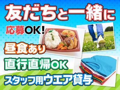 【保険制度】 雇用保険、労災保険、健康保険、厚生年金 待遇・福利厚生 【福利厚生】 ✅交通費支給(規定あり) ✅昼食お弁当支給 ✅制服あり ┗レア!イベントスタッフ限定! ✅扶養内勤務OK ✅副業・WワークOK ✅社員登用あり ✅友達と応募OK