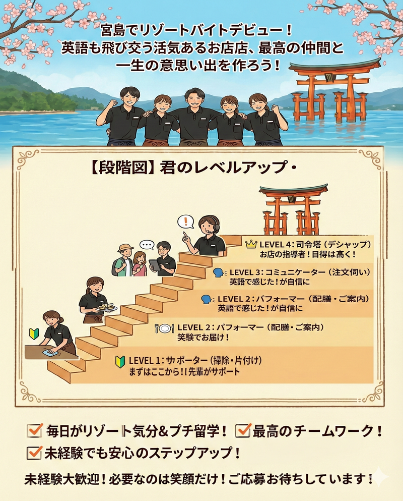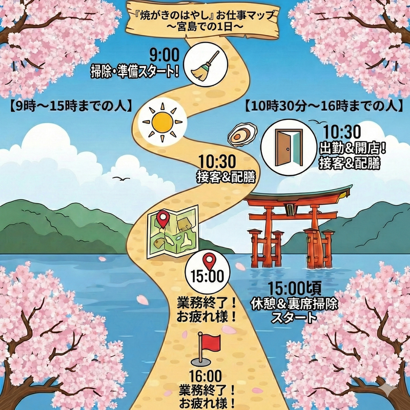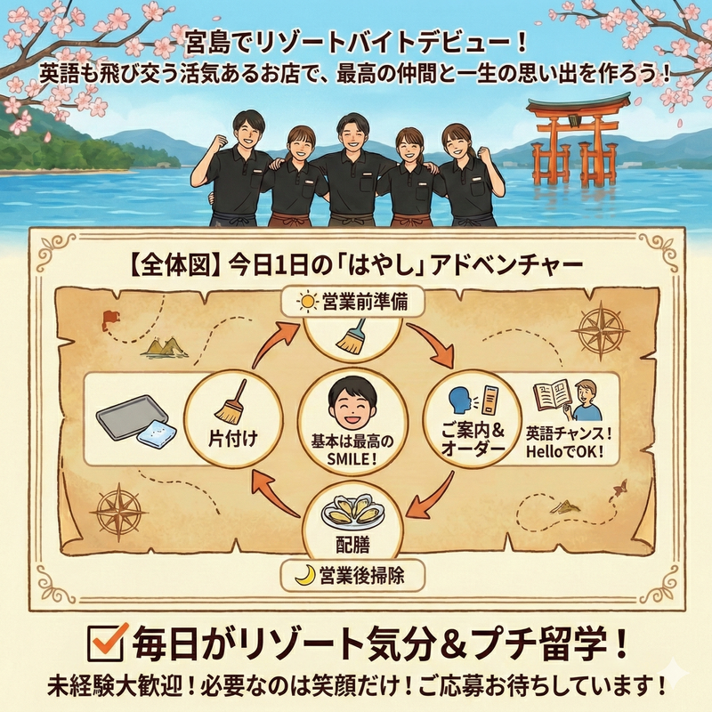 仕事内容 当店は、広島県宮島にある 老舗の食堂「焼がきのはやし」です。 創業以来、多くのお客様に愛される 焼き牡蠣をはじめとする海産物料理を 提供しています。 【募集内容】 ・客室業務全般 ......................... 宮島には多くの観光客が訪れますが、 当店はその中でも地元の方にも愛される名物店です。 私たちと一緒に、お客様に美味しい料理と 素敵な時間を提供しませんか? 皆様からのご応募をお待ちしております! 我社は宮島でもっとも信頼のおける店ということを ガイド協会の方々にもお墨付きをいただいております。 是非、私たちと宮島に来ていただいた方に 食という形でいい思い出を作る手助けをしませんか?
