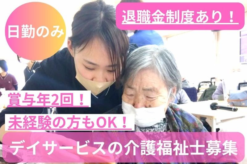 【アピールポイント】 デイサービスの介護スタッフの募集です♪ ●日勤のみ! ●未経験OK! ●賞与年2回! ●年間休日110日! ●退職金制度あり!