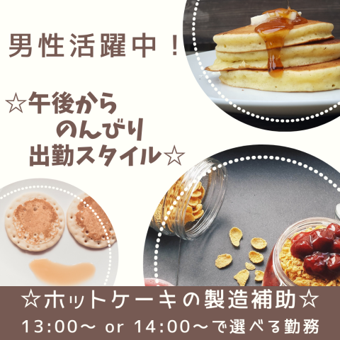 午後からゆったりスタート!早起きがニガテな方も安心♪ イズタニワークフォースソリューションズ ホットケーキの製造補助 【働きやすさのPOINT】 ・土日祝はしっかりお休み♪ ・髪型&髪色は自由! ・整理整頓されたきれいな工場 ・職場見学OK!事前に雰囲気をチェックできるから安心 【活躍中のスタッフ】 ・20代・30代・40代の男性スタッフが中心に活躍中! ・未経験スタートの方や、フリーター・ブランクありの方も多数在籍 ・コツコツ作業やモクモク系が好きな方にピッタリです♪