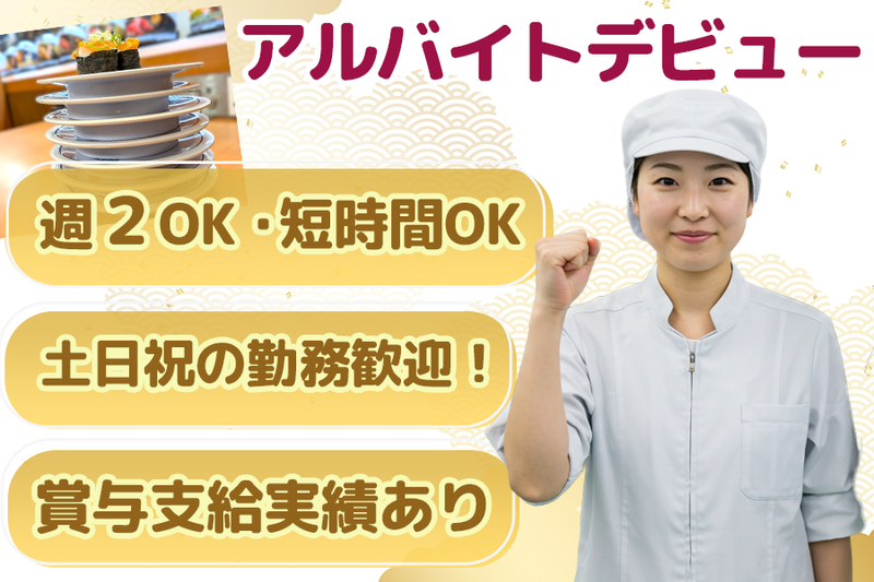 応募資格 ■必須条件 ・週2日~週3日以上勤務できる方 ■歓迎条件 ・土日祝に勤務できる方 ・未経験者歓迎 ・飲食店での勤務経験がある方 ・アルバイトデビューの方 ・接客の仕事に興味がある方 ■こんな方に向いています ・覚えやすい仕事を探している方 ・接客はしたいけれど、注文対応が多すぎる環境は不安な方 ・学校帰りや休日に働きたい方 ・食べることやお寿司が好きな方