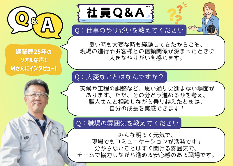 選考プロセス 新築・リフォームのご依頼増加に伴い、体制強化のため増員募集を行います。 今後は若手メンバーを中心に、さらに活気ある職場づくりを目指しています。 未経験の方はイチから丁寧にサポートしますのでご安心ください。 経験者の方は、これまでのスキルを活かし即戦力として活躍できる環境です。 ぜひ私たちと一緒に働きましょう! 【選考フロー】 書類選考 → 最終面接 → 内定