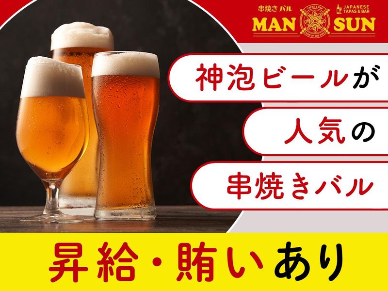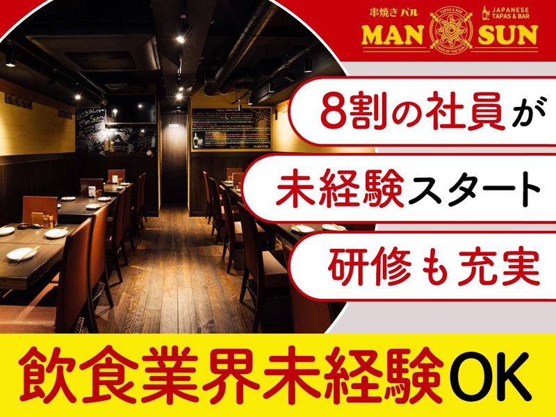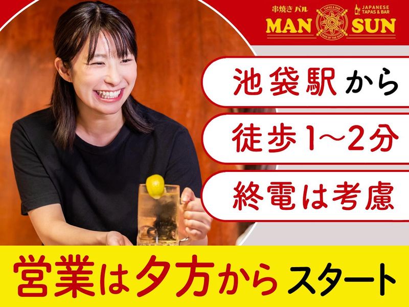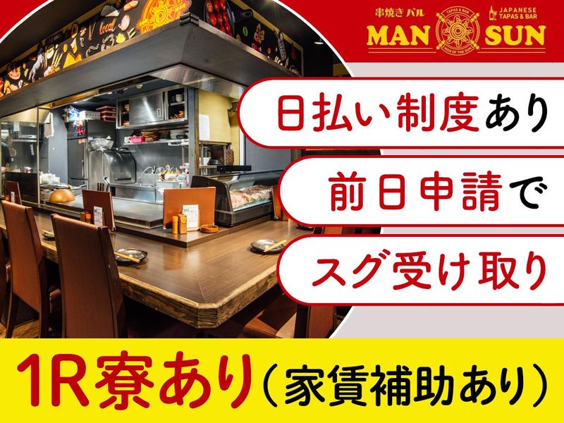 仕事内容 ―――――――――――――― 未経験から始められる! 人気飲食店の正社員スタッフ✨ ――――――――――――――― 人気”神”泡ビール&おいしい串焼き を扱うおしゃれなバルで働こう♪ 『串焼きバルManSun』 正社員大募集!! オススメPOINT💡  ̄ ̄V ̄ ̄ ̄ ̄ ̄ ̄ ̄ ̄ ̄ ̄ ̄ ̄ ̄ ̄ ̄ ̄ ̄ ✅無資格・未経験・学歴一切不問 ✅日払い制度あり◎前日申請でスグ受け取り ✅インセンティブ制度あり ✅「池袋駅」から徒歩1~2分 ✅嬉しいまかないあり ✅1R寮完備!家賃補助あり ✅20代〜40代の男女スタッフ活躍中! ✅終電を考慮します! ――――――――――――――― ⭐仕事内容⭐  ̄ ̄V ̄ ̄ ̄ ̄ ̄ ̄ ̄ ̄ ̄ ̄ ̄ ̄ ̄ ̄ ̄ ̄ ̄ ■お客様を席へご案内 ■注文のお伺い ■お料理の提供 ■レジ対応 ■テーブルの片付け など接客全般をお任せ! 他、スキルや能力に合わせて ■店舗の売上管理 ■食材の仕入れ ■スタッフの勤怠管理や教育 などもお任せします! 未経験の方でもまずは簡単な来店対応から 初めていただくのでご安心ください♪ ⭐接客経験・調理経験が無くても安心!⭐  ̄ ̄V ̄ ̄ ̄ ̄ ̄ ̄ ̄ ̄ ̄ ̄ ̄ ̄ ̄ ̄ ̄ ̄ ̄ 8割以上が未経験から正社員へ✨ ■もともとアルバイトから正社員へ!/20代女性 ■前職は営業マンとして勤務!/30代男性 ■全く異業種のドライバーからの転職/40代男性 など全くの未経験から正社員になってる方がほとんど! 先輩のサポートで一歩ずつ覚えていける環境です。 最初はできることから丁寧に教えていきますので ご安心くださいね◎ <こんな不安もご相談ください> Q:飲食店での経験がないけど働ける? A:接客方法やオーダーの取り方など 丁寧にサポートするのでご安心ください Q:残業やお休みがないイメージがあって不安 A:残業は多少ある時期もありますが 終電を超えることはありません! ✨その他ポイント✨  ̄ ̄V ̄ ̄ ̄ ̄ ̄ ̄ ̄ ̄ ̄ ̄ ̄ ̄ ̄ ̄ ̄ ̄ ̄ <日払い制度あり> 前日申請で、働いた分の最大70%を即日支給可能! 急な支出が必要な場合や、 収入のタイミングを柔軟に調整したい場合に便利♪ <充実の福利厚生> ◎昇給・昇格あり ◎社会保険完備 ◎制服貸与 ◎交通費支給 ◎まかない付き ◎1Rの寮完備!補助サポートあり(寮費半額) 寮から池袋までのアクセスも楽々!