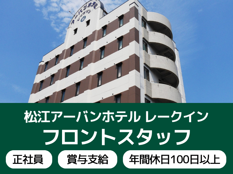 仕事内容 JR松江駅から徒歩約5分、松江観光の拠点にもビジネス利用にも最適な松江アーバンホテルレークインのフロント正社員スタッフの募集です。 ◆JR松江駅から徒歩約5分のホテル! ◆正社員採用!社員数170名・創業約60年の安定企業で安心。 ◆賞与年2回(前年度実績:計2か月) ◆実力次第で昇格や、大幅な昇給も! ◆働きやすく意見の言いやすい環境づくりに取り組んでいます! 【具体的な業務内容】 ・お客様のチェックイン・チェックアウト業務 ・会計業務 ・予約や問い合わせなどの電話対応 ・お客様の案内接客 ・売上集計 など ━‥━‥━‥‥━‥━‥━‥━‥━‥━‥━ ★島根の観光に力を注ぐ会社です! ¨¨¨¨¨¨¨¨¨¨¨¨¨¨¨¨¨¨¨¨¨¨¨¨¨¨¨¨¨¨¨ 当社は、島根県松江&石見エリアで複合施設 ホテル、ツアー、特産物の販売などを営みながら 島根の地域活性に取り組んでいる企業です。 希望次第でレストランでの仕事のみならず、 地域活性化に幅広くかかわることができます。 ★ 働きやすさが自慢 ¨¨¨¨¨¨¨¨¨¨¨¨¨¨¨¨¨¨¨¨¨¨¨¨¨¨¨¨¨¨¨ 平均残業時間は5時間 シフト希望も通りやすい! 女性管理職比率は41%で女性も活躍。 毎月、社員からのアイデアを募る会議を実施ています! ★ 未経験も◎キャリアアップも叶う! ¨¨¨¨¨¨¨¨¨¨¨¨¨¨¨¨¨¨¨¨¨¨¨¨¨¨¨¨¨¨¨ 接客の仕事が初めてでも大丈夫! 先輩スタッフが丁寧にレクチャーするので安心です◎ 困ったときは皆で助け合えるチーム力も当社の魅力♪